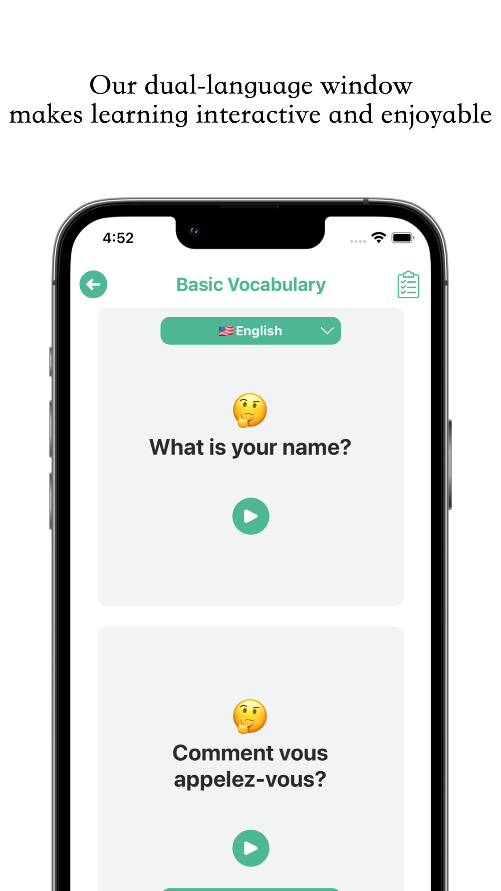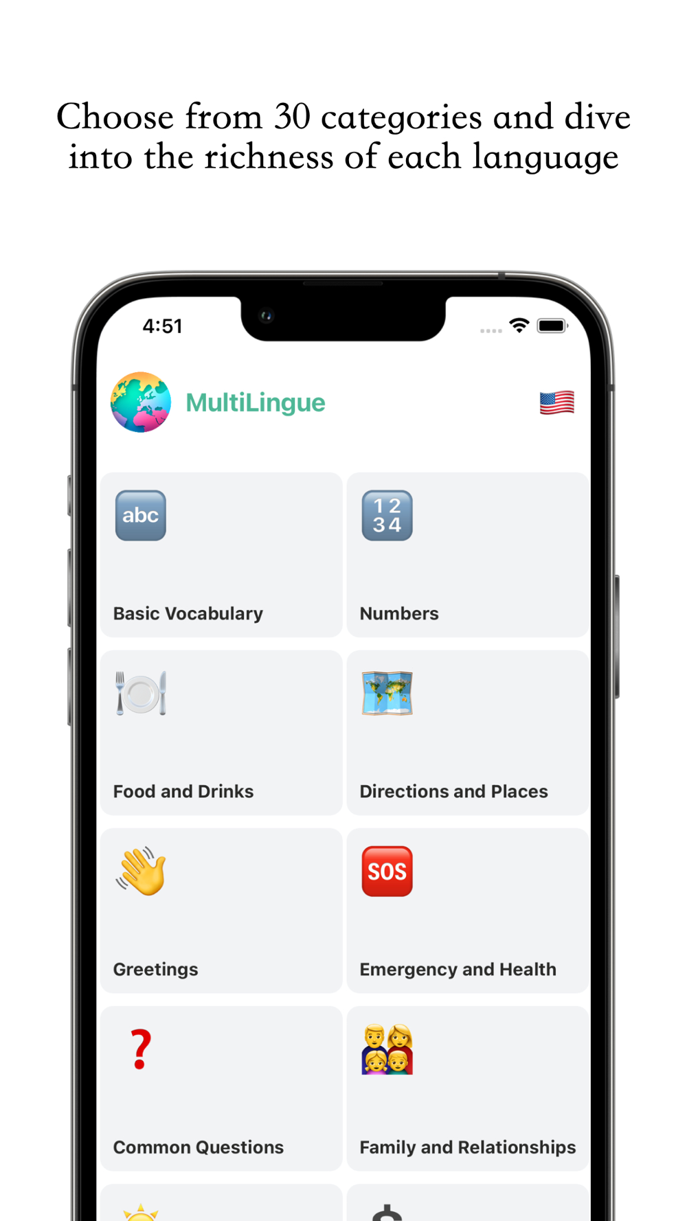 Begib dich auf eine umfassende sprachliche Reise mit Multilingue! Diese innovative App bietet eine interaktive Vertiefung in 30 Kategorien, von grundlegendem Vokabular bis zu spezialisierten Gesprächen. Ob Sie Zahlen, Grüße, Küche oder sogar Politik meistern möchten, Multilingue begleitet Sie auf jedem Schritt.