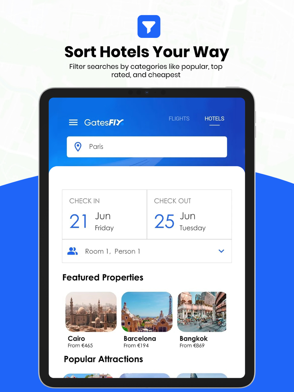 Download GatesFly now and start your journey with significant savings on your next flight or hotel booking!
