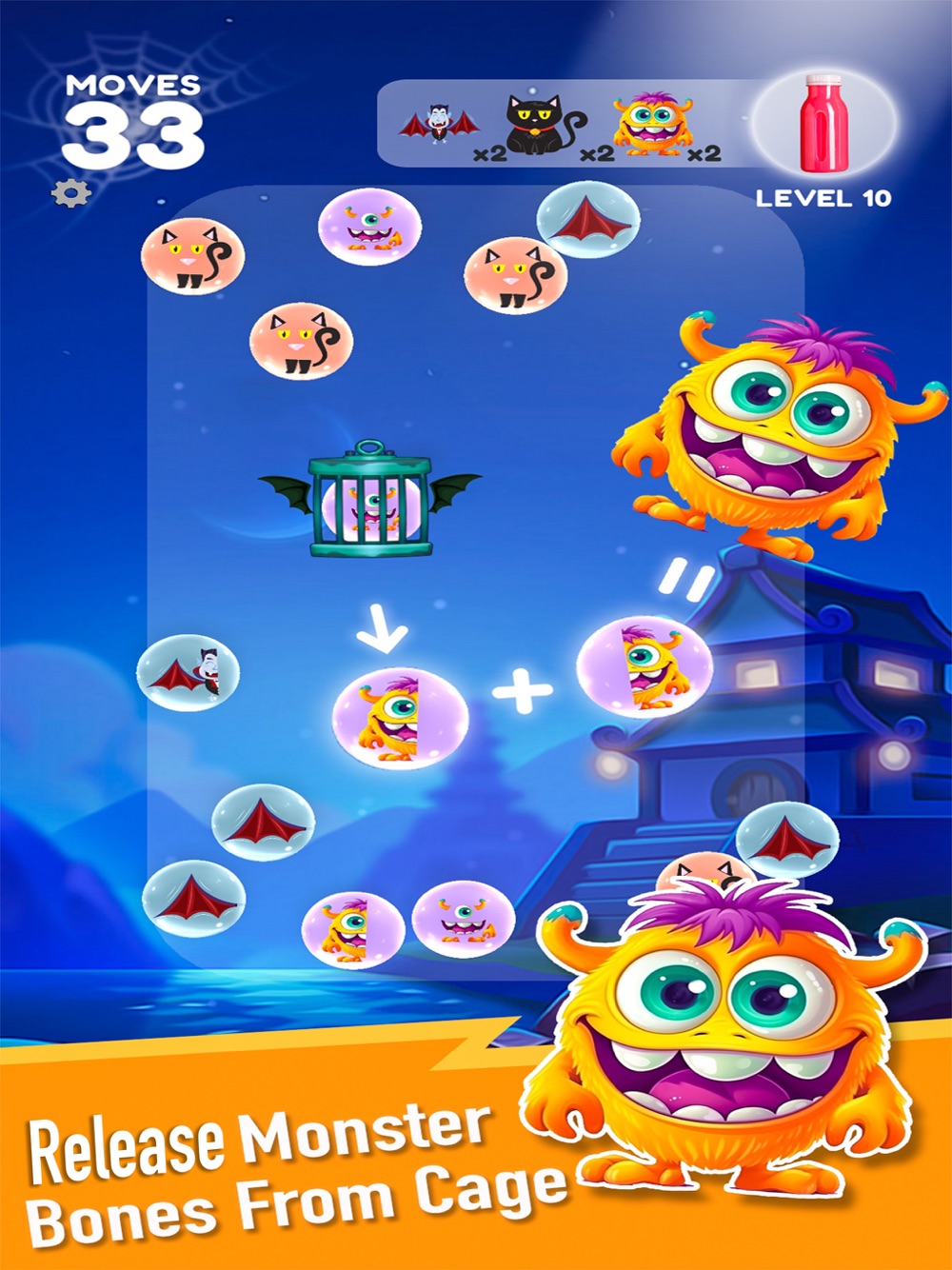 Merge Bones: Start with simple bones trapped in bubbles. Merge these bones to form partial shapes of monsters.