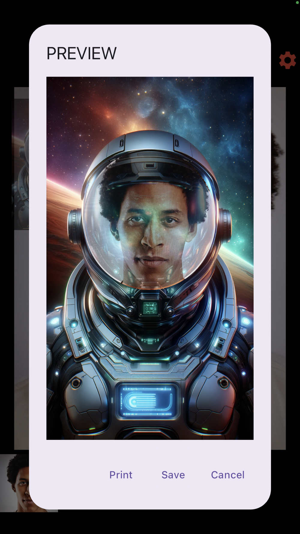 5. From the preview screen, you can tap Save to save it to your photo album and continue to the next shoot. You can tap Print and it will allow you to print to any compatible printer, or you can also share the image via email or text messaging.