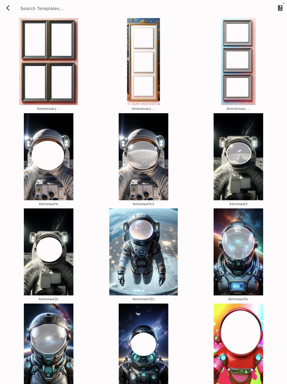 7. You can select a different template by tapping the template button; they are listed in alphabetical order. You can use the search to find your templates, for example, "Halloween" to find all Halloween-themed templates. In the template screen, you can tap the Photo Album icon to import your own templates. Any PNG files with at least 1 transparent area will be detected. Keep the number of photos to be fewer than 10, and the image dpi 300 or under. PartyPhoto will remember your last selected template and the search criteria. This will make it super easy for continuous photo shoots and maintaining a consistent party theme.