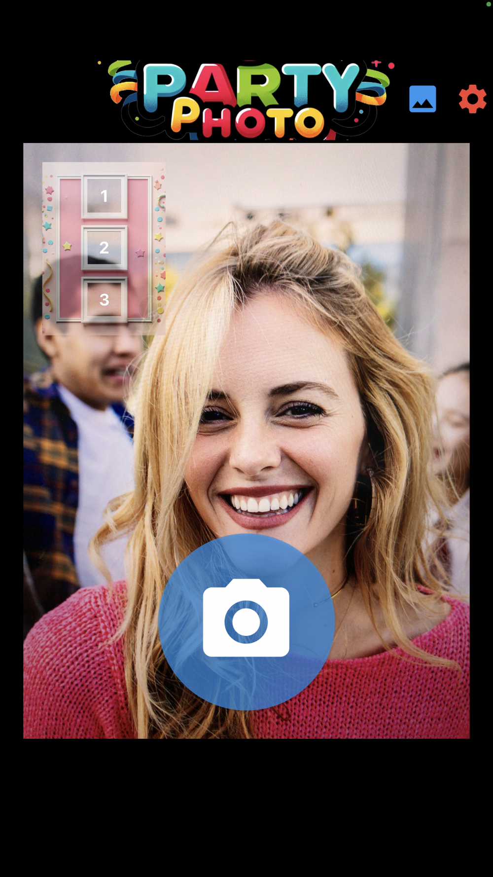 6. You can also change the settings by tapping the settings button: front or rear camera, flash or no flash, zoom or close-up, timer from 1 to 10 seconds, and a branding text to appear at the bottom right of the photo strip.