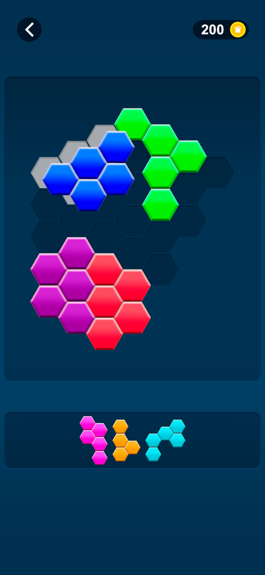 Just drag the blocks and fill the hexagonal grid to complete the levels.
