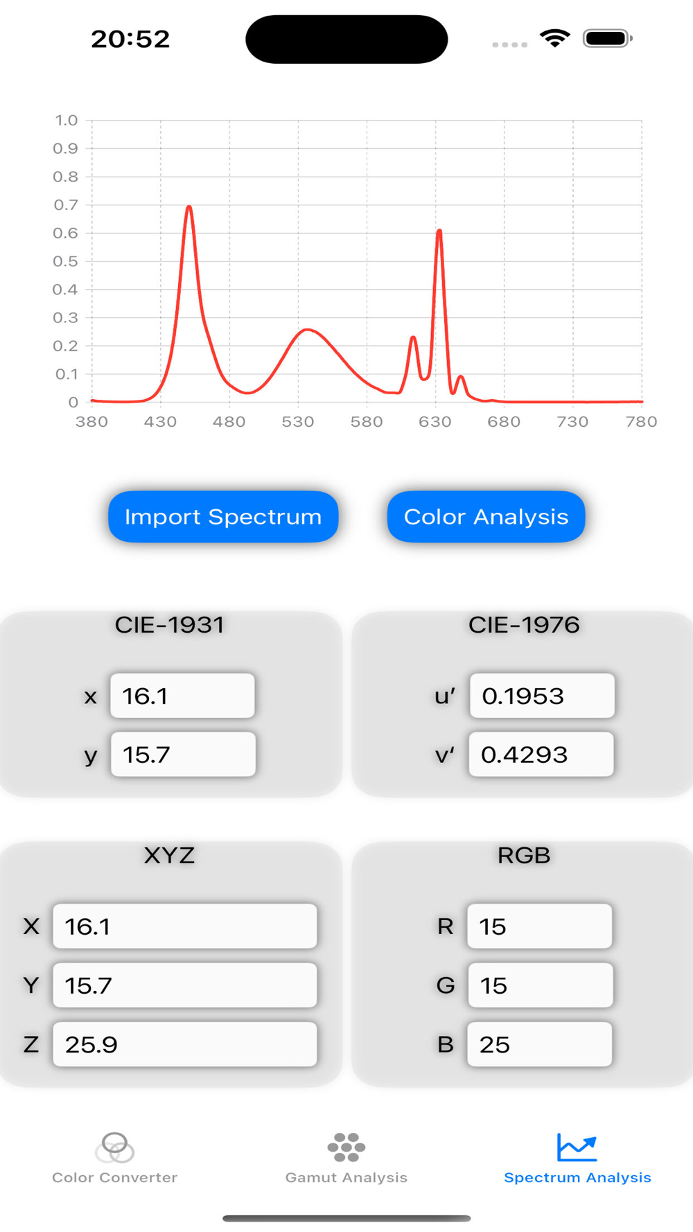 您的掌上色彩管理与辅助分析助手!本软件支持色彩转换器,实现RGB表色系到CMYK、HSV、LAB、HEX表色系的转换;光谱分析,通过380~780可见光波段CSV格式光学图谱,分析计算CIE-1931、CIE-1976 color point x、y、u、v数据;以及色域分析,通过导入Red、Green、Blue Pattern三原色(x、y)坐标csv档案,计算分析DCI-P3、NTSC、sRGB、Adobe RGB色域覆盖率。