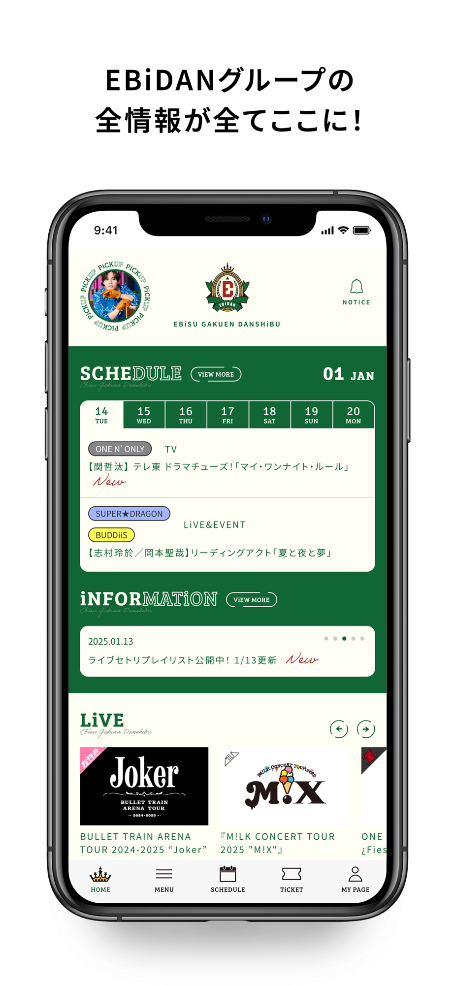 このアプリではEBiDANのグループの最新ニュース、スケジュールなどをまとめて確認することができます。
