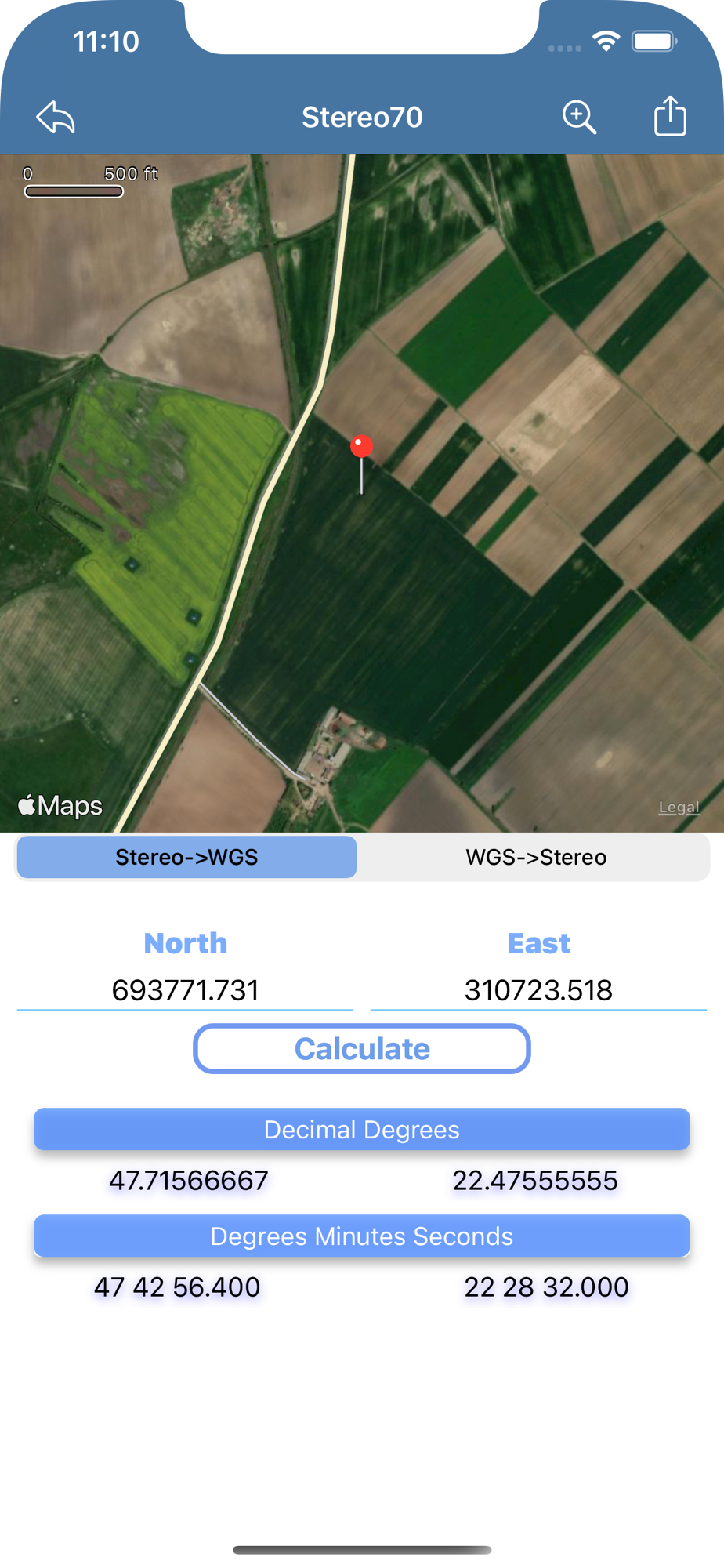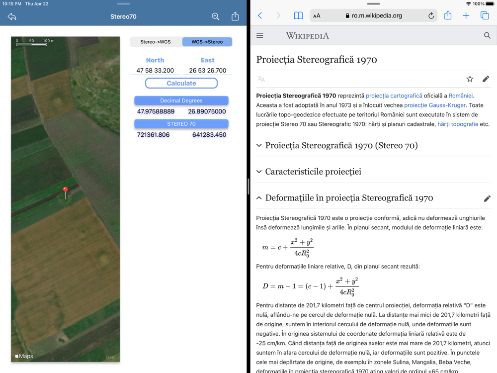 iStereo70 the first application for iPhone and iPad which help you to convert coordinates Stereo70 to WGS84 (ETRS89) or vice versa and check the location on Map (requires an internet connection).