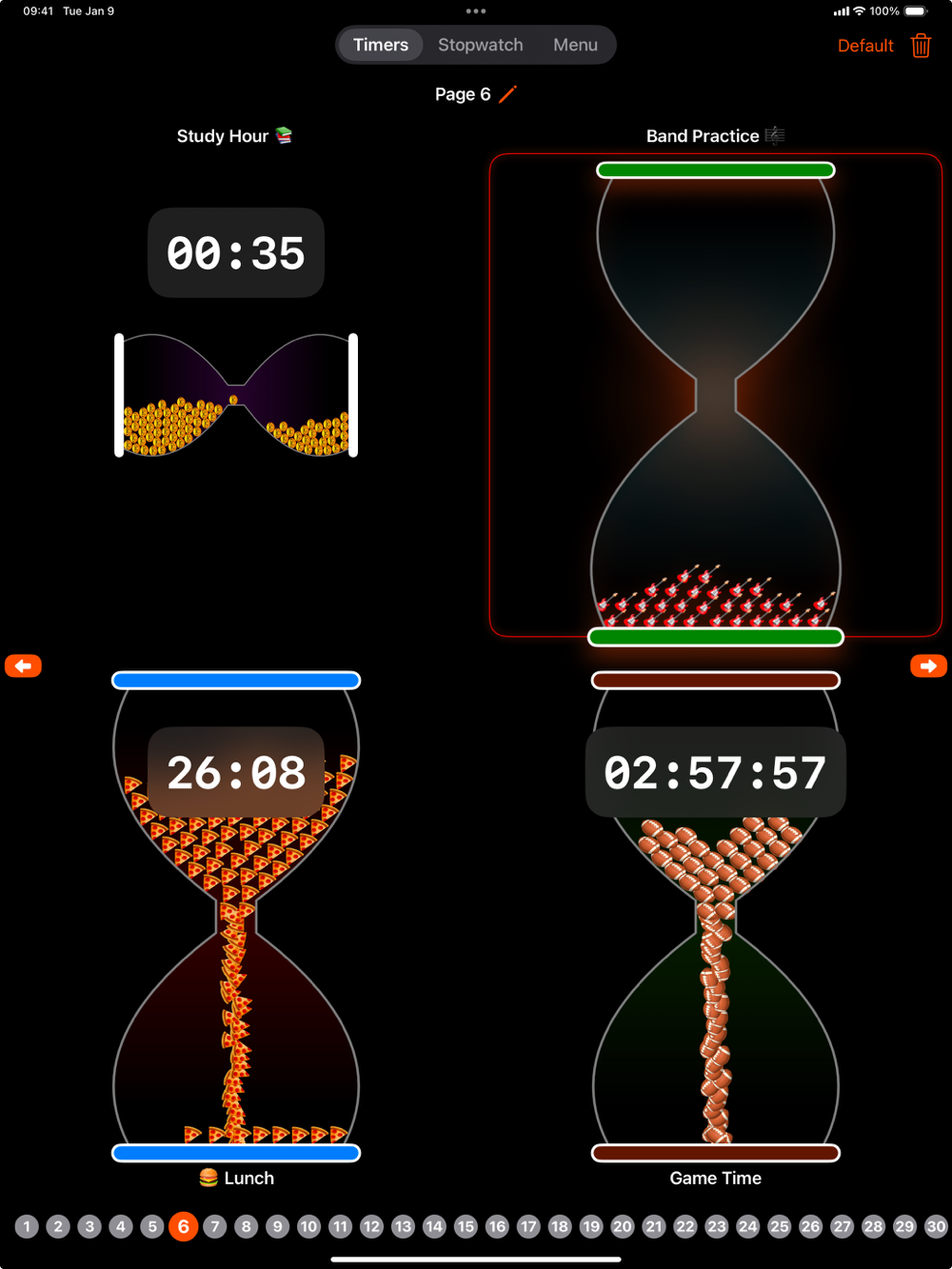 Create up to 400 active timers neatly arranged across 100 custom-named pages. Track “Leg Day,” “Pet Meals,” “Pomodoro Rounds,” and more. Label your timers and pages however you want, with or without emojis.