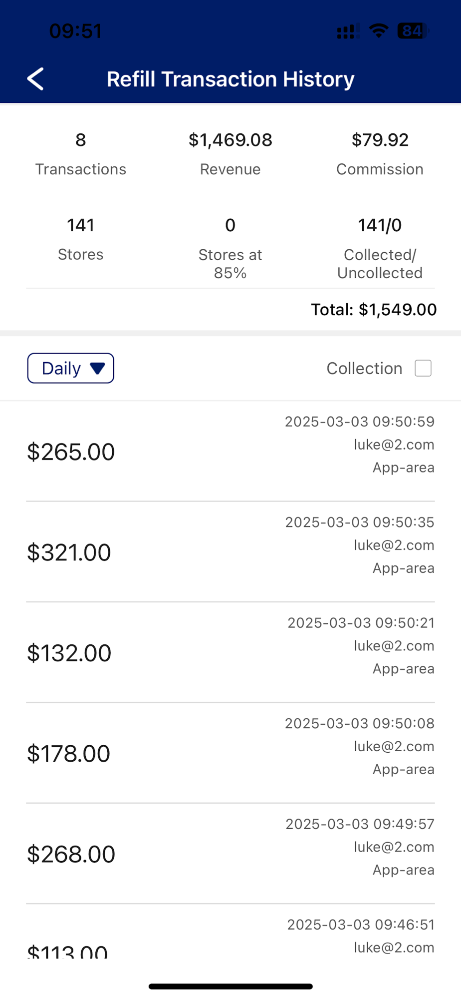 This app enables store owners to top up consumers' accounts with cash. Administrators can also view historical transaction records and statistical reports.