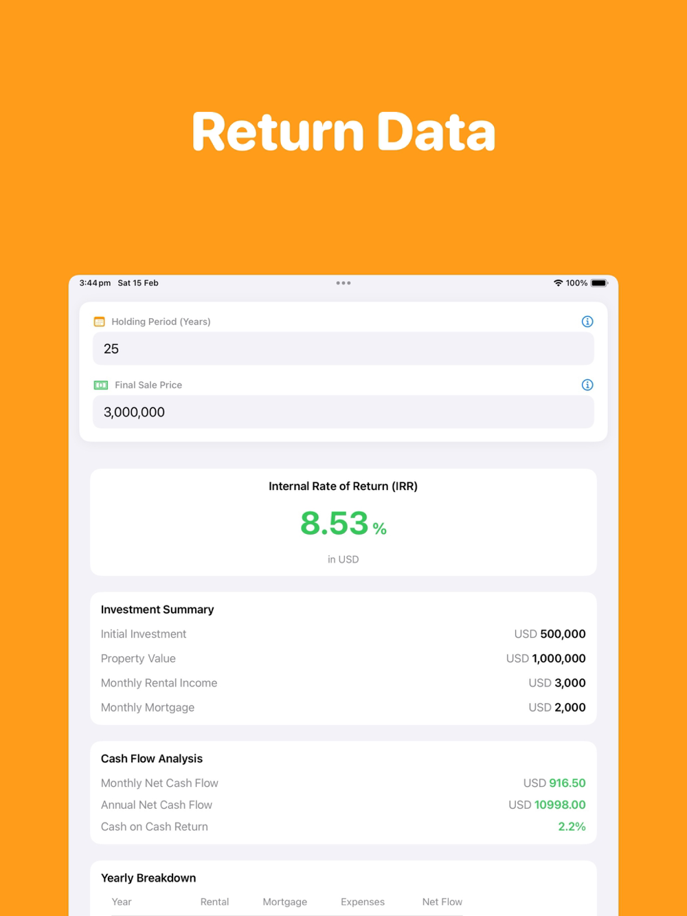 • Calculate Internal Rate of Return (IRR) for real estate investments