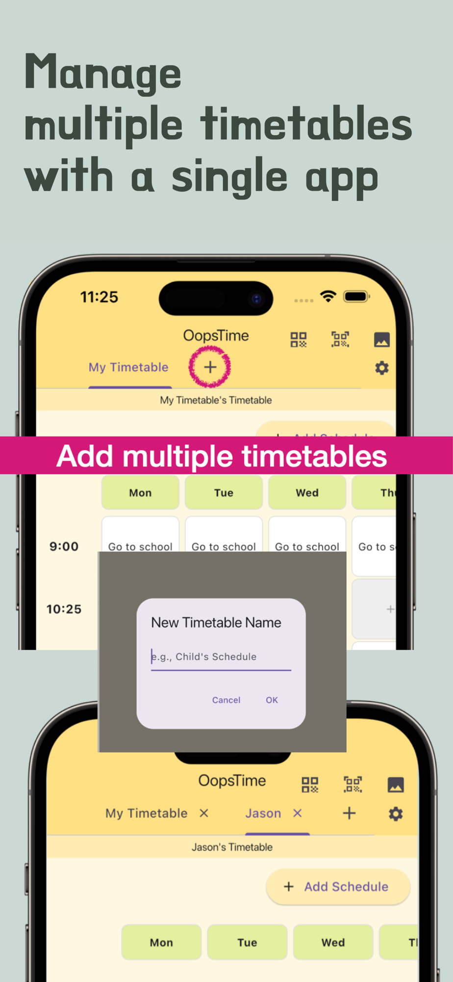 Store up to 5 different timetables — perfect for managing by child or purpose.