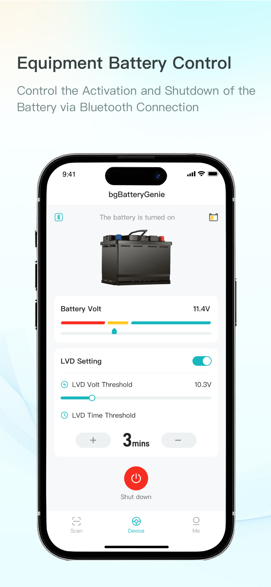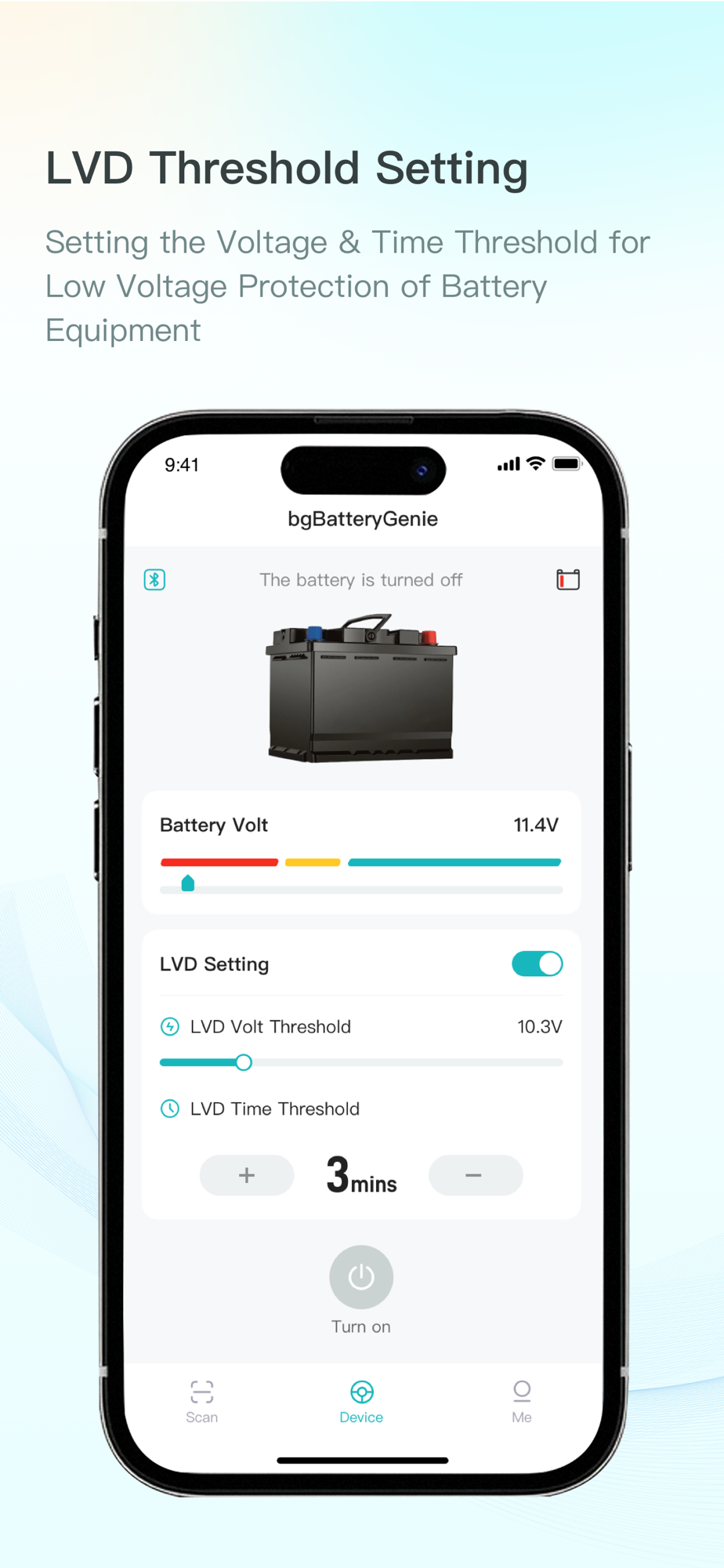 bgBatteryGenie collects the working status of the equipment battery in real time via Bluetooth. Users can monitor parameters such as the voltage of the equipment battery in real time. When users do not use the equipment battery for a long time, they can temporarily turn off the equipment battery through bgBatteryGenie, which can avoid failures caused by long-term power consumption of the equipment battery. At the same time, bgBatteryGenie has a low-voltage detection automatic power-off protection function. When the equipment battery is in a power-deficient state, bgBatteryGenie automatically triggers the protection function through the LVD (Low Voltage Disconnect) function to further save the equipment's power and extend the service life of the equipment battery.