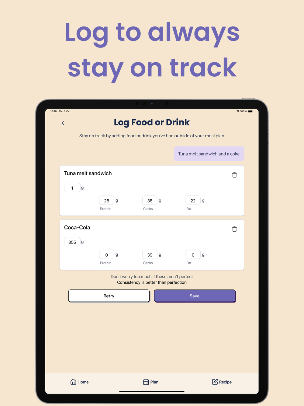 Flexible Macro Tracking – We calculate and adjust your targets so you don't have to