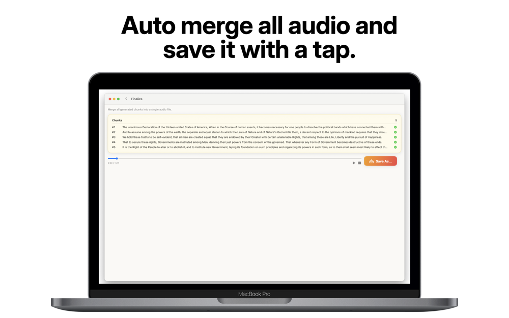• Unlimited text input (long scripts are chunked and exported as a single audio file)