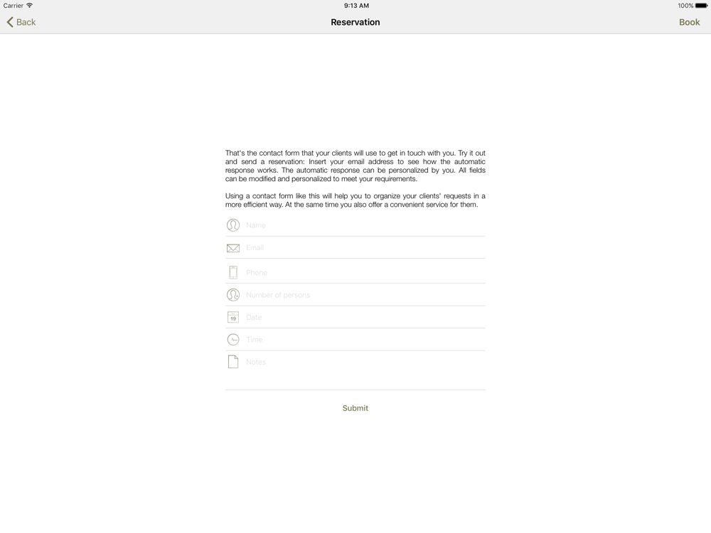 Create your corporate app with your name and your logo, present your services, promote your company and get yourself in touch with your clients.