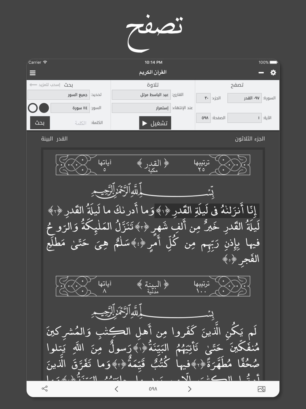 - إمكانية التنقل بين السور والآيات والأجزاء والصفحات بسرعة وسهولة.