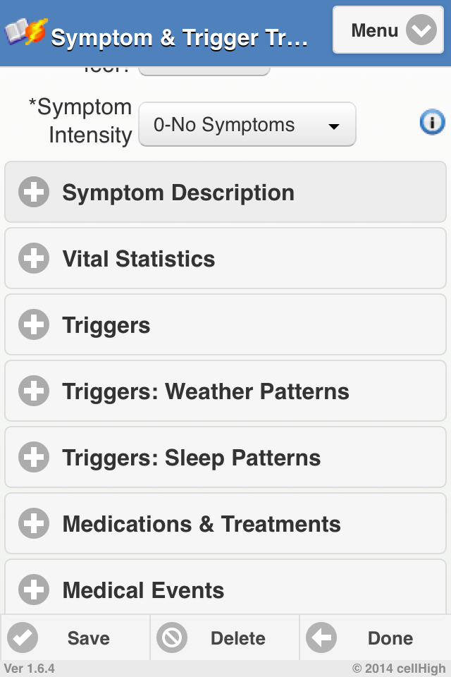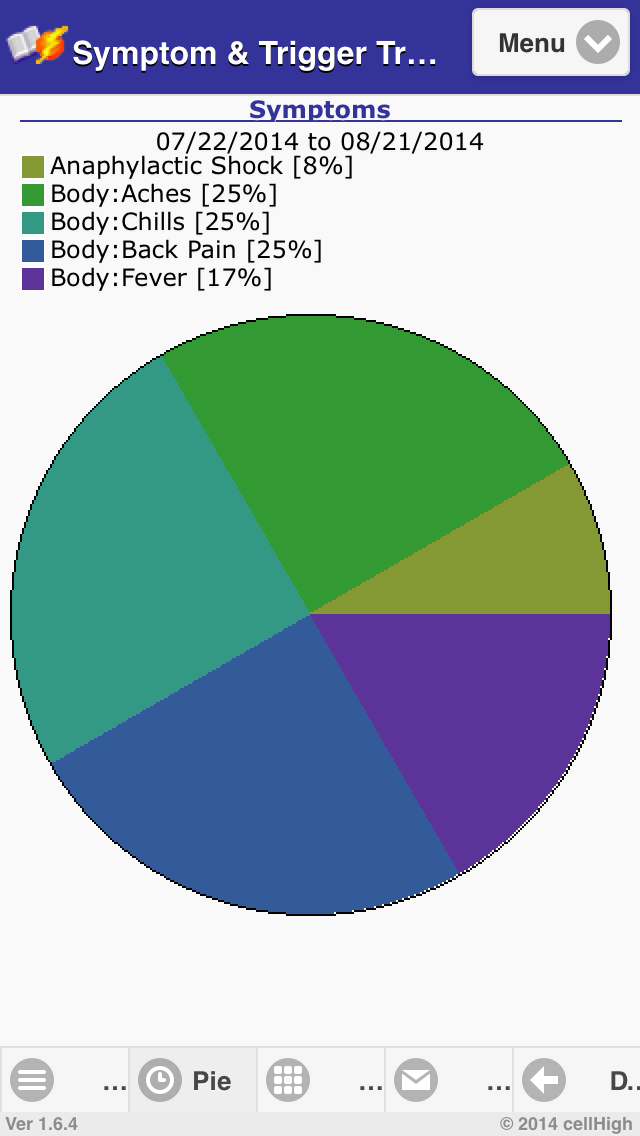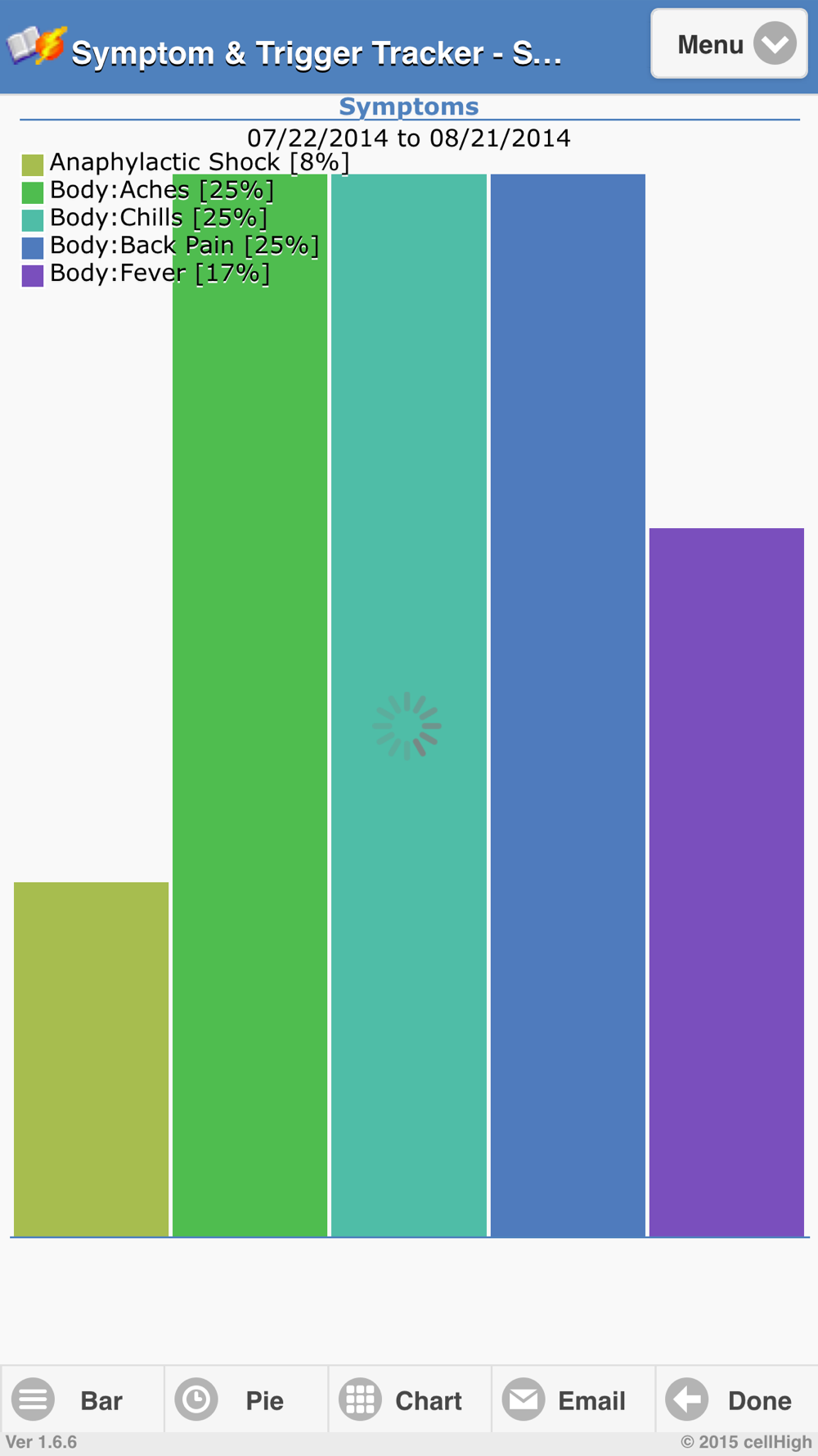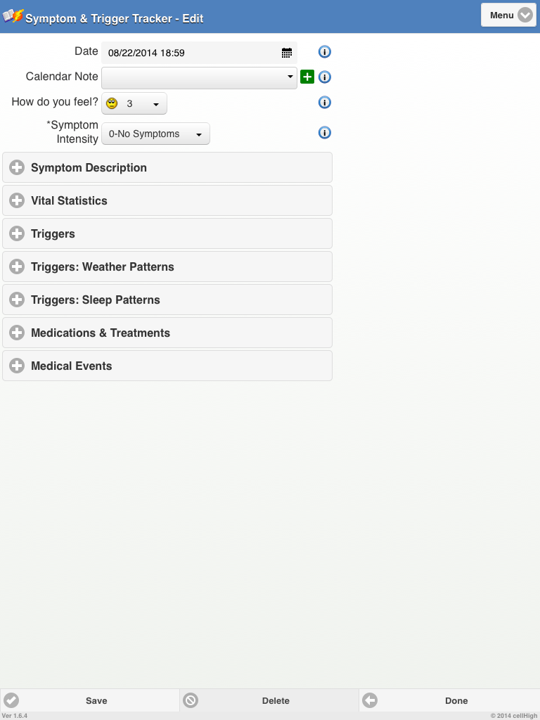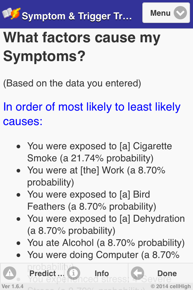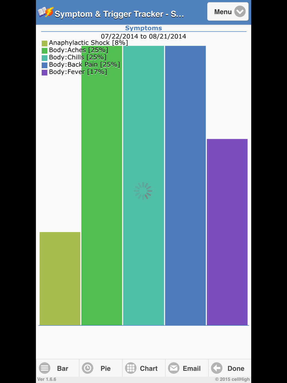 Do you suffer from frequent illnesses? Do you not feel well most of the time? How can Symptom & Trigger Tracker help? Symptom & Trigger Tracker was designed to track information about your symptoms and possible contributing factors with a few screen taps. Using this information, the application will allow you to use triggers, factors and even things like day of month and week, stress, weather patterns, diet, sleep patterns, etc. to predict and manage your Symptoms. Symptom & Trigger Tracker has a “Trending and Forecasting” module that shows you which factors and triggers contribute to your symptoms. This will help you feel better and will allow you to take control of your Symptoms. Symptom & Trigger Tracker makes it easy to perform tasks like tracking your symptoms, factors, graphing your patterns, emailing reports, including graphical attachments to your doctor and advisors. Symptom & Trigger Tracker will also allow you to export your data to a spread sheet all with just a few screen taps. Do you want all of your information at your fingertips so that you can start feeling better? Symptom & Trigger Tracker can help.