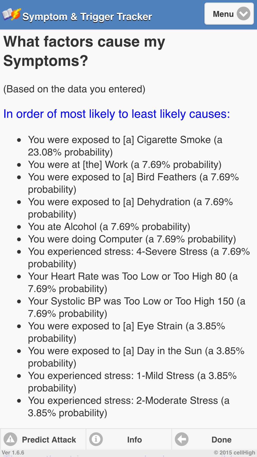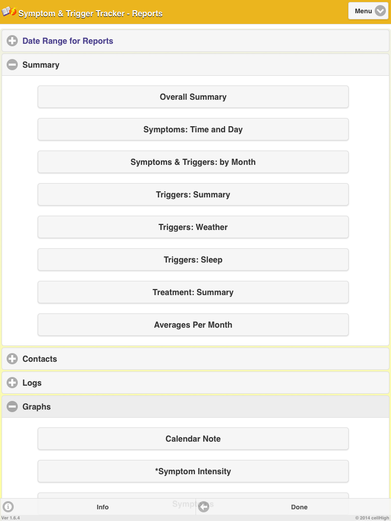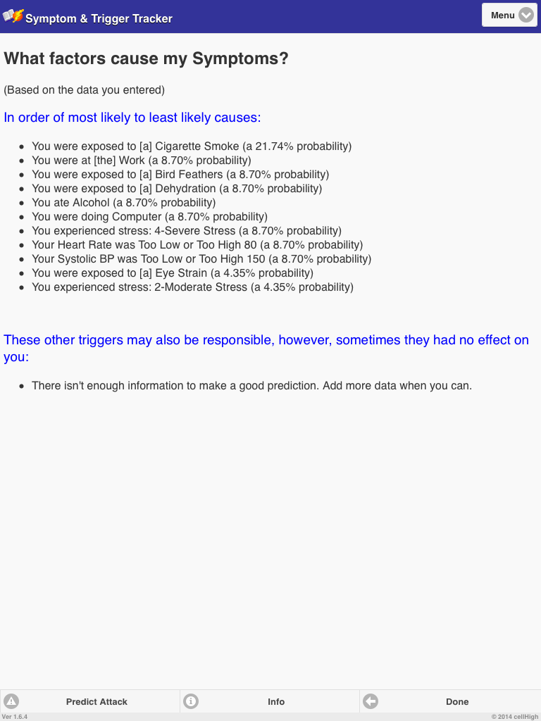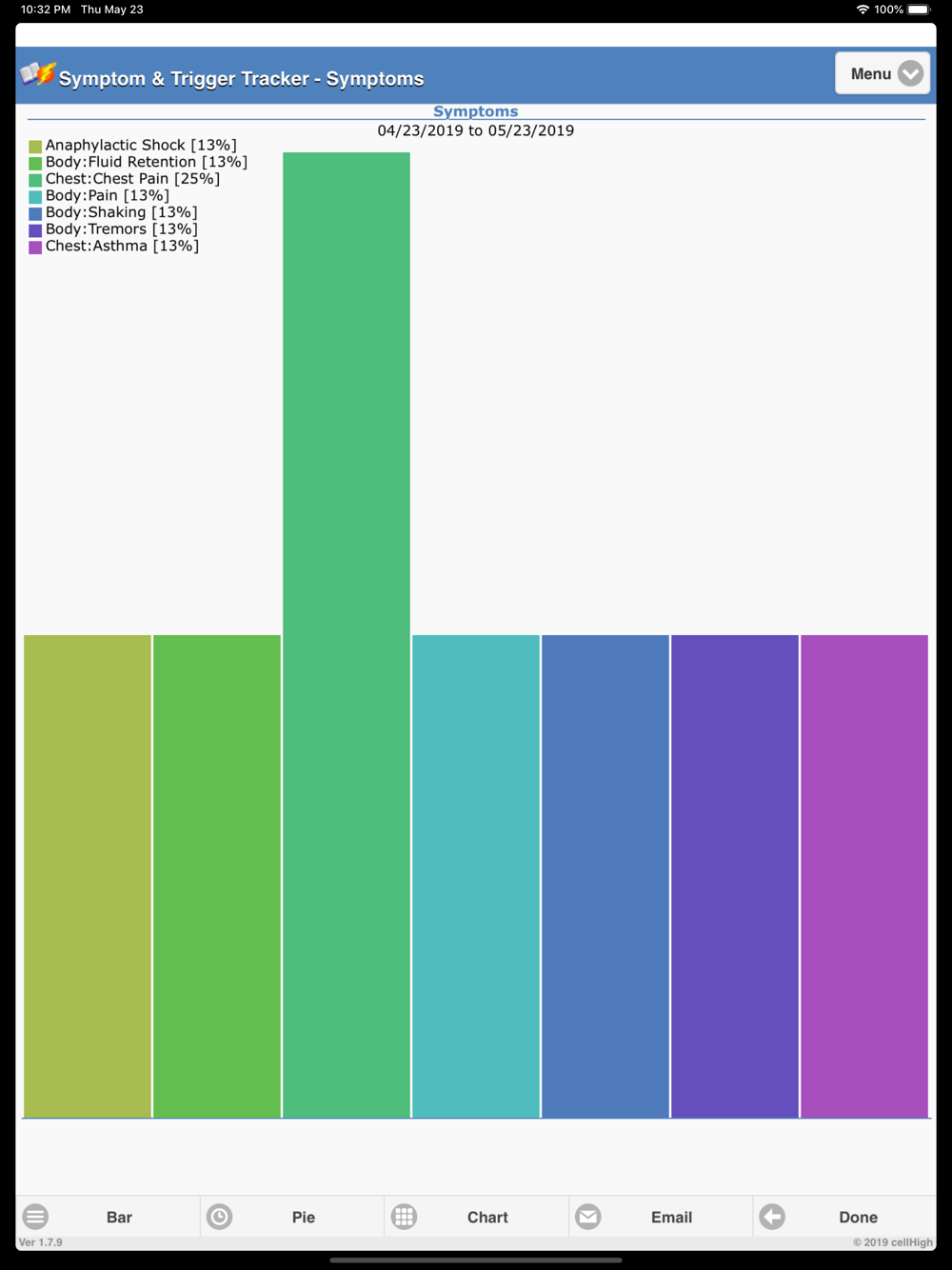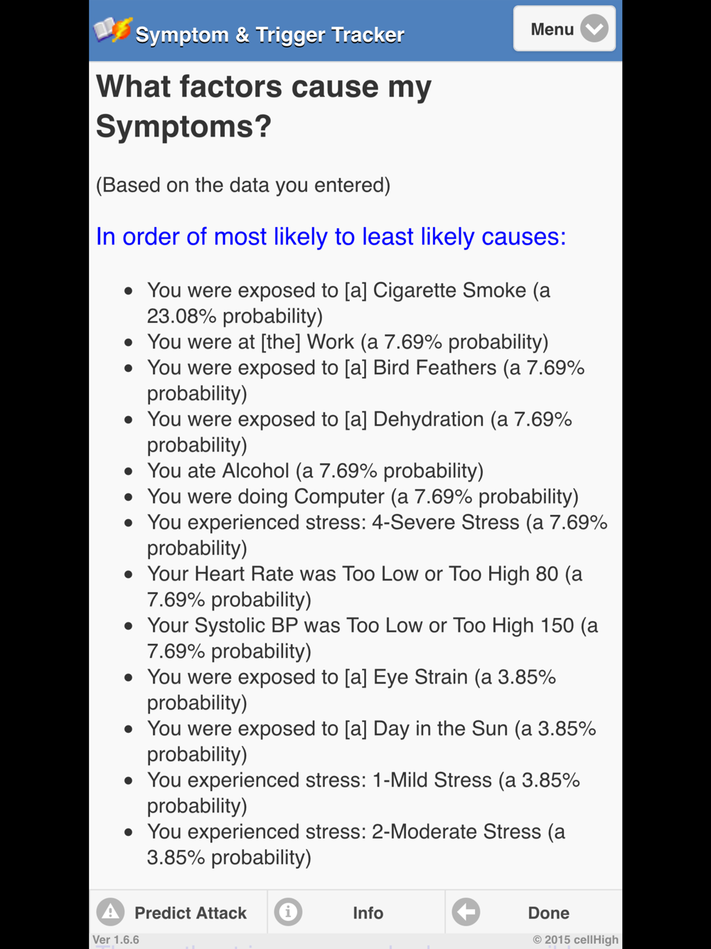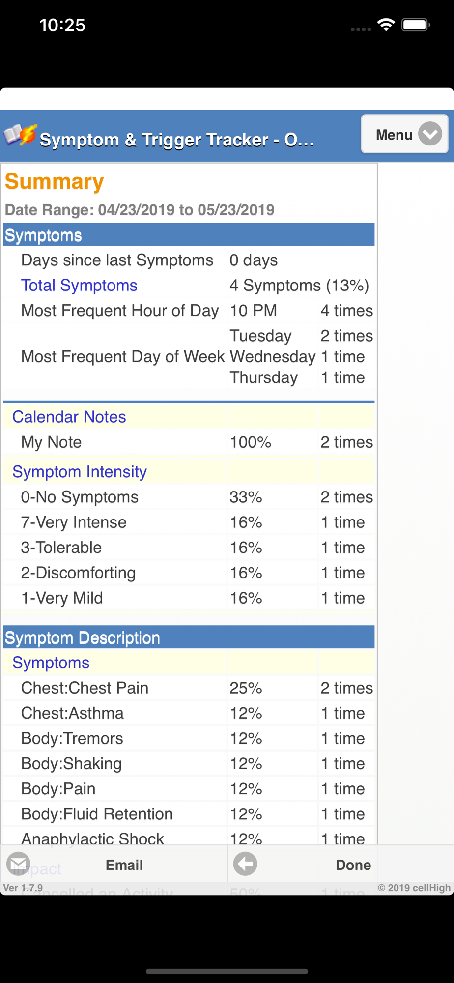 Do you suffer from frequent illnesses? Do you not feel well most of the time? How can Symptom & Trigger Tracker help? Symptom & Trigger Tracker was designed to track information about your symptoms and possible contributing factors with a few screen taps. Using this information, the application will allow you to use triggers, factors and even things like day of month and week, stress, weather patterns, diet, sleep patterns, etc. to predict and manage your Symptoms. Symptom & Trigger Tracker has a “Trending and Forecasting” module that shows you which factors and triggers contribute to your symptoms. This will help you feel better and will allow you to take control of your Symptoms. Symptom & Trigger Tracker makes it easy to perform tasks like tracking your symptoms, factors, graphing your patterns, emailing reports, including graphical attachments to your doctor and advisors. Symptom & Trigger Tracker will also allow you to export your data to a spread sheet all with just a few screen taps. Do you want all of your information at your fingertips so that you can start feeling better? Symptom & Trigger Tracker can help.