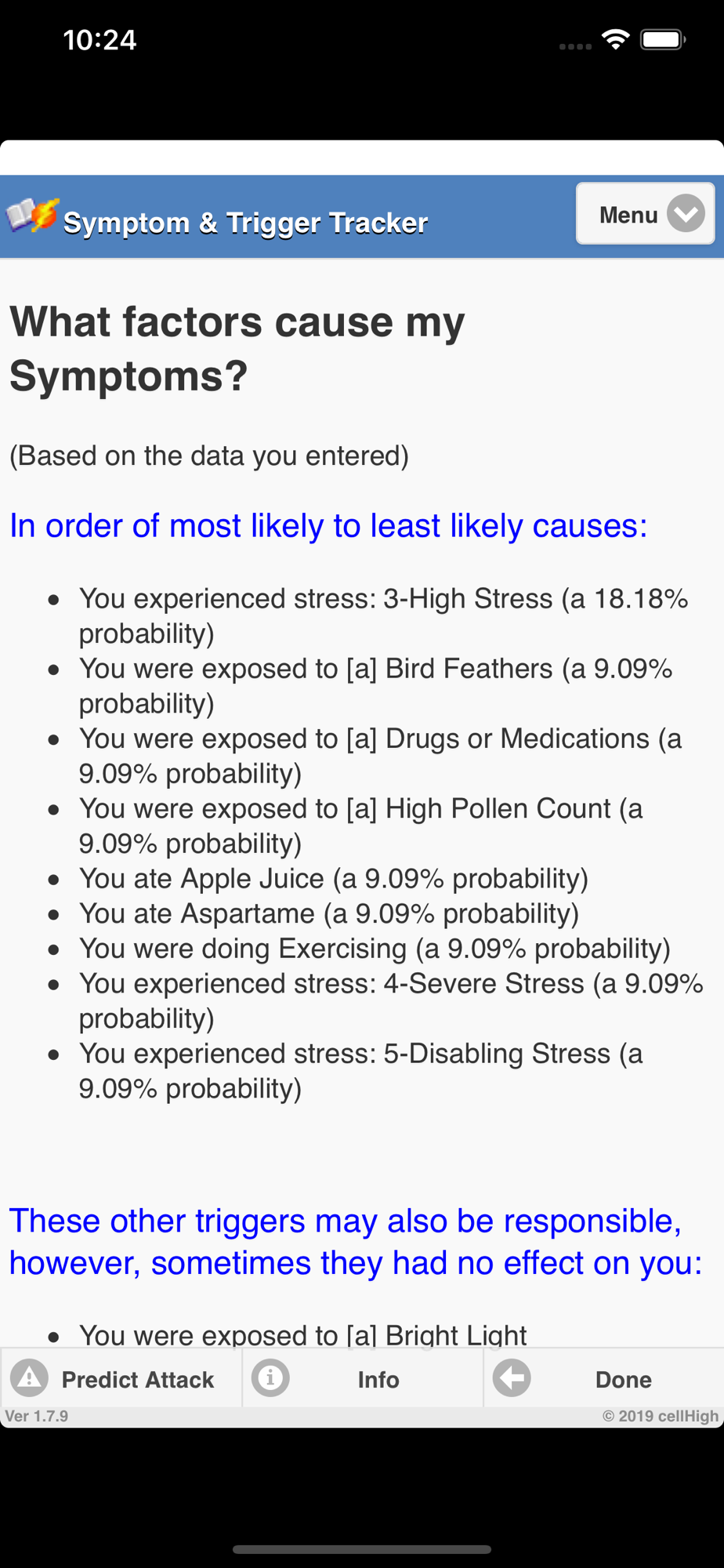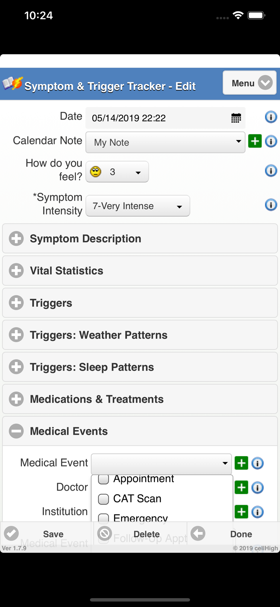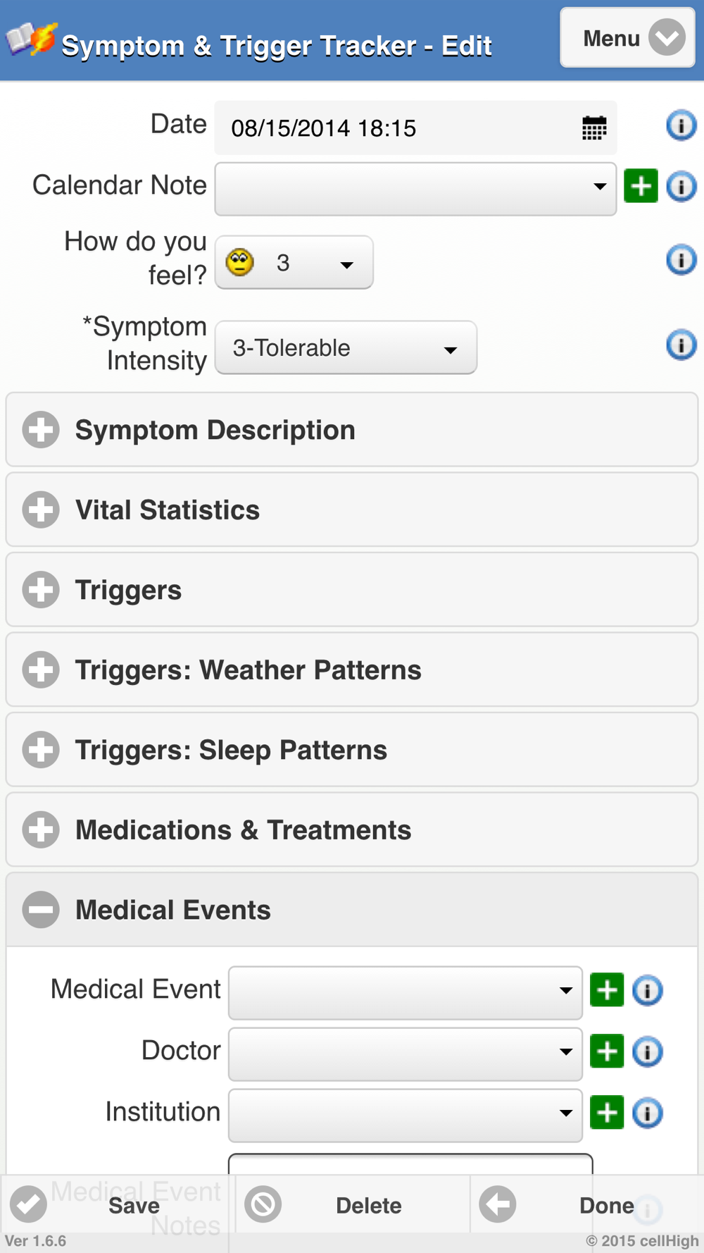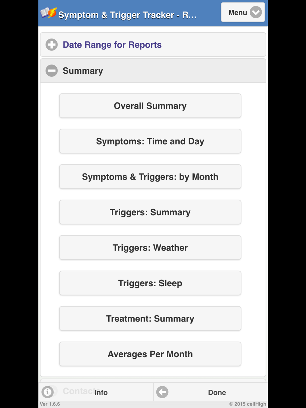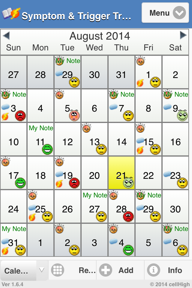 Do you suffer from frequent illnesses? Do you not feel well most of the time? How can Symptom & Trigger Tracker help? Symptom & Trigger Tracker was designed to track information about your symptoms and possible contributing factors with a few screen taps. Using this information, the application will allow you to use triggers, factors and even things like day of month and week, stress, weather patterns, diet, sleep patterns, etc. to predict and manage your Symptoms. Symptom & Trigger Tracker has a “Trending and Forecasting” module that shows you which factors and triggers contribute to your symptoms. This will help you feel better and will allow you to take control of your Symptoms. Symptom & Trigger Tracker makes it easy to perform tasks like tracking your symptoms, factors, graphing your patterns, emailing reports, including graphical attachments to your doctor and advisors. Symptom & Trigger Tracker will also allow you to export your data to a spread sheet all with just a few screen taps. Do you want all of your information at your fingertips so that you can start feeling better? Symptom & Trigger Tracker can help.
