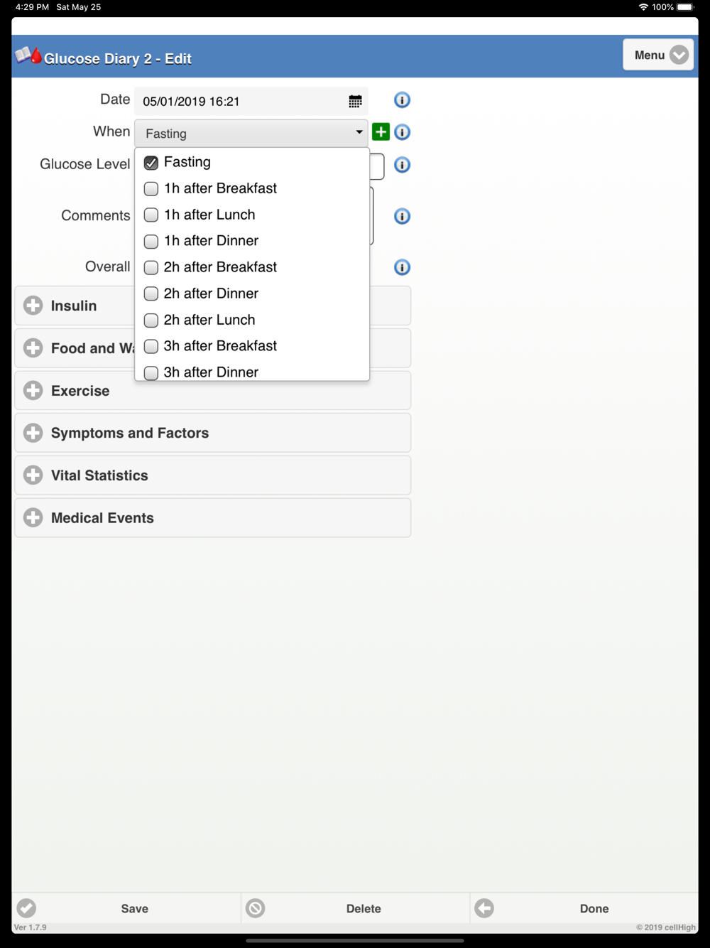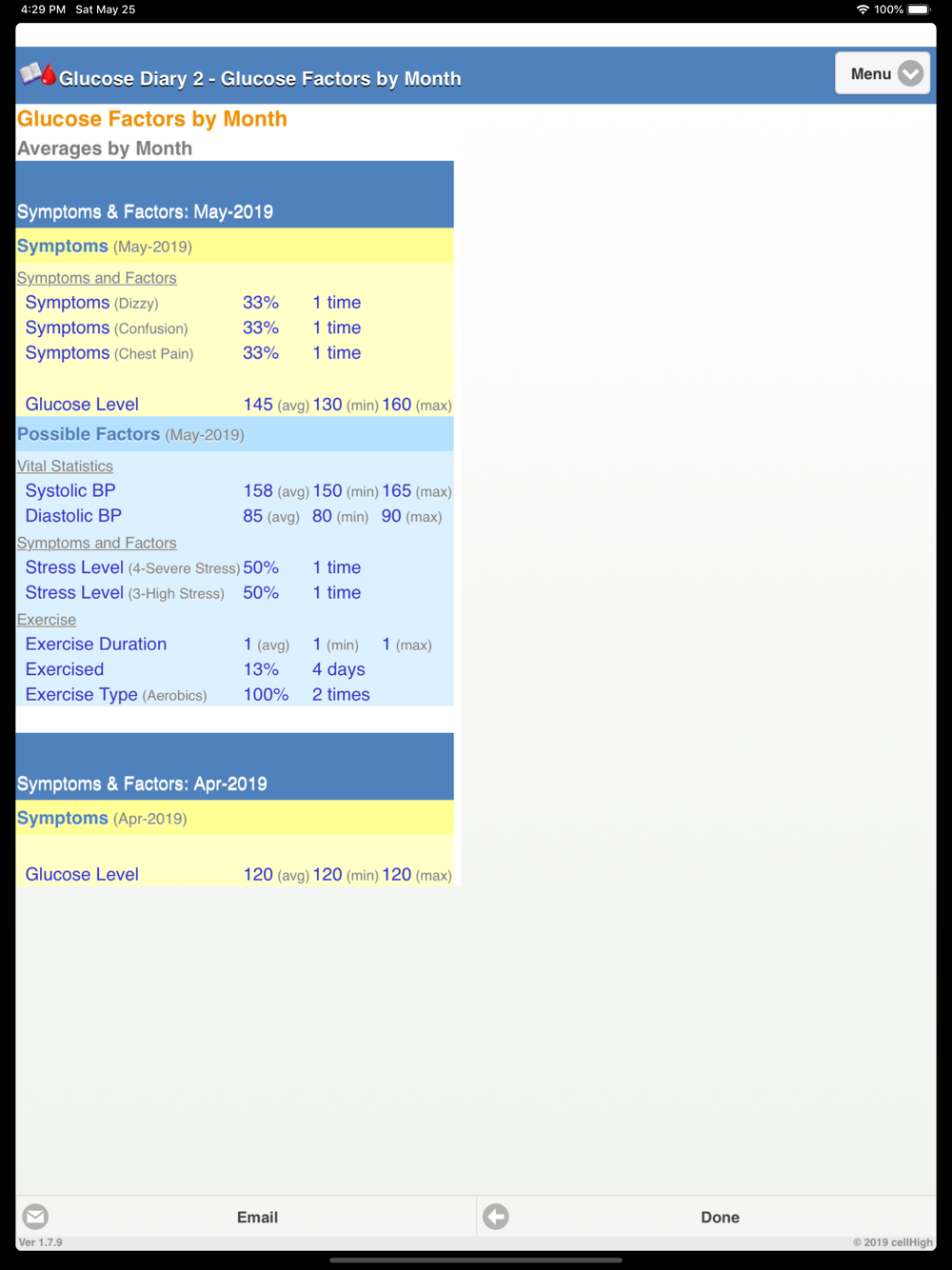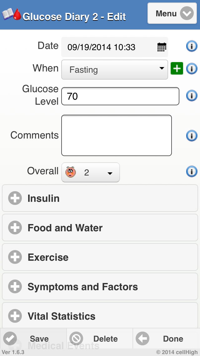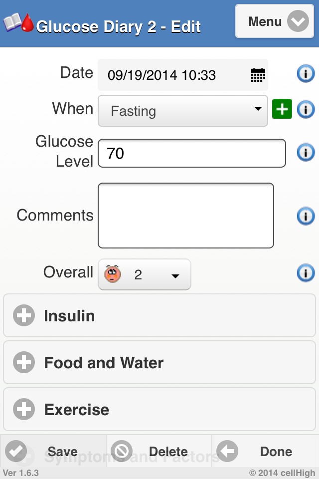 Are you like one of the billions of Americans who experience high or low blood sugar? How can Glucose Diary 2 help? Glucose Diary helps you track your blood sugar easily with only a few screen taps. GD Glucose Diary allows for tracking of glucose levels, insulin, food, carbs, medication, exercise, weight, BP, stress levels, sleep and a host of extras like injection sites, symptoms and lab test results all with just a few screen taps. Enter as little or as much data as you need. Create new items, new medication names, new insulin brand name, new symptoms etc. in your selectable lists. Glucose readings are color coded for easy assessment and can be entered in mg/dL or mmol/L. The app has several reports and graphs that show numerous statistics including overall averages, minimum, maximum, weekly and daily distributions. Glucose Diary makes it easy to perform tasks like graphing your patterns, emailing reports, including graphical attachments to your doctor and advisers. Glucose Diary will also allow you to export your data to a spread sheet, backup data offline and all, again, with just a few screen taps. This is one of the most helpful tools for you and your doctors. It helps you and your doctor understand and analyze your progress easily, accurately and with fewer mistakes. Do you want all of your health records and information at your fingertips so that you can start feeling better Glucose Diary2 can help.
