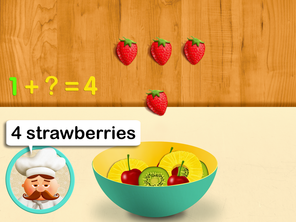 This is a math learning app, which will help your child learn addition, and represent addition problems with drawings, verbal explanation, and math equations - while helping Chef prepare his signature Spicy Hula Monkey Cake, and over 40 other outrageous dishes.