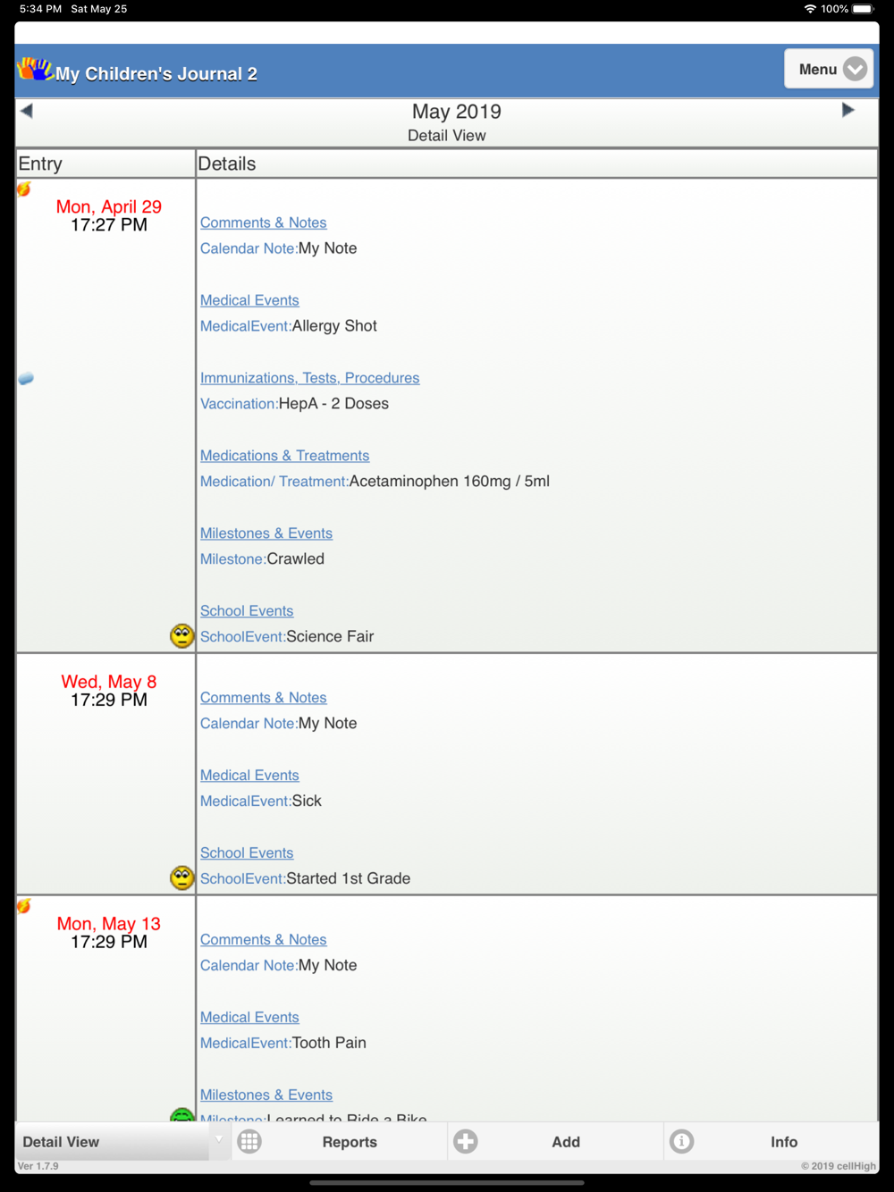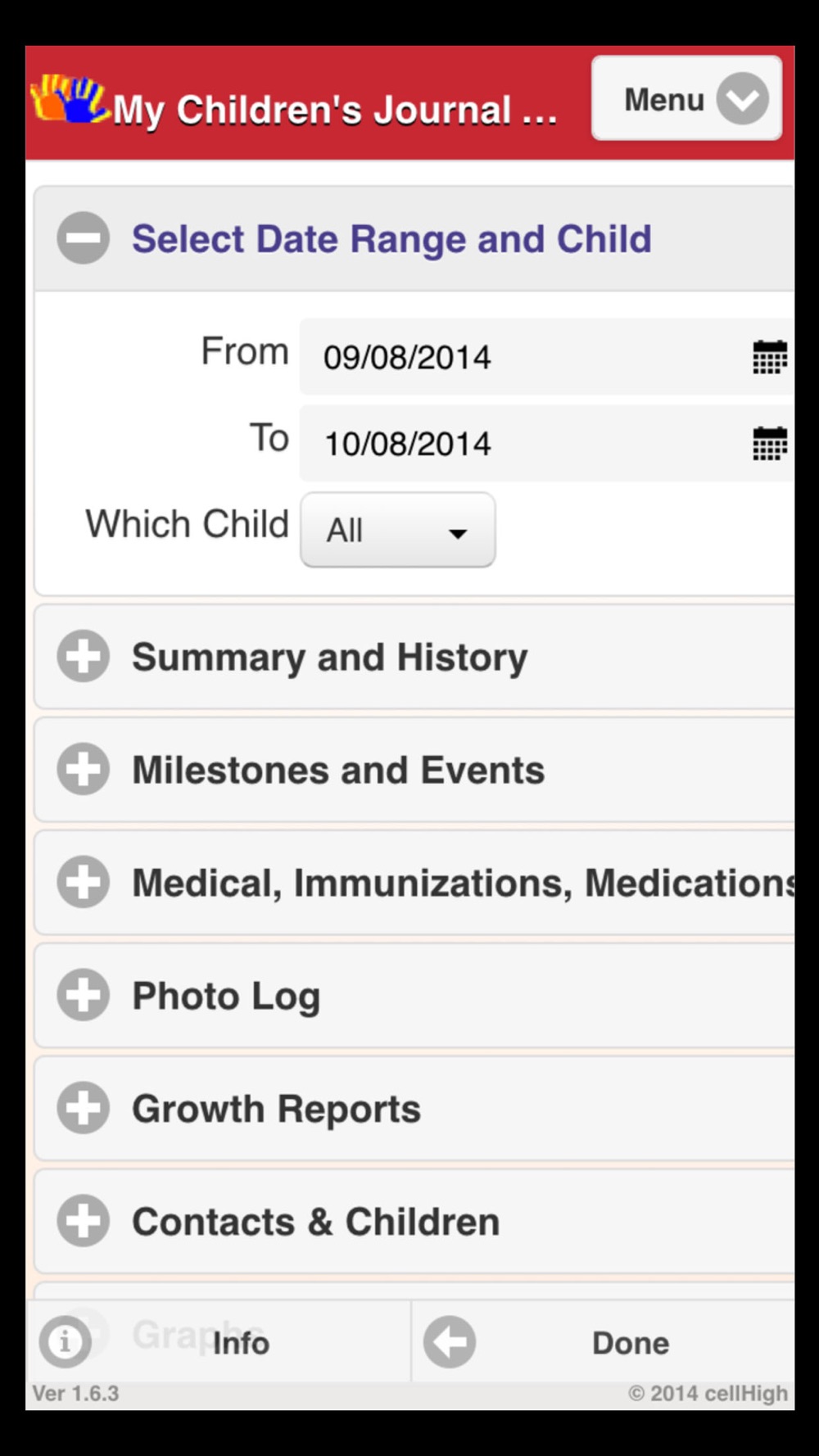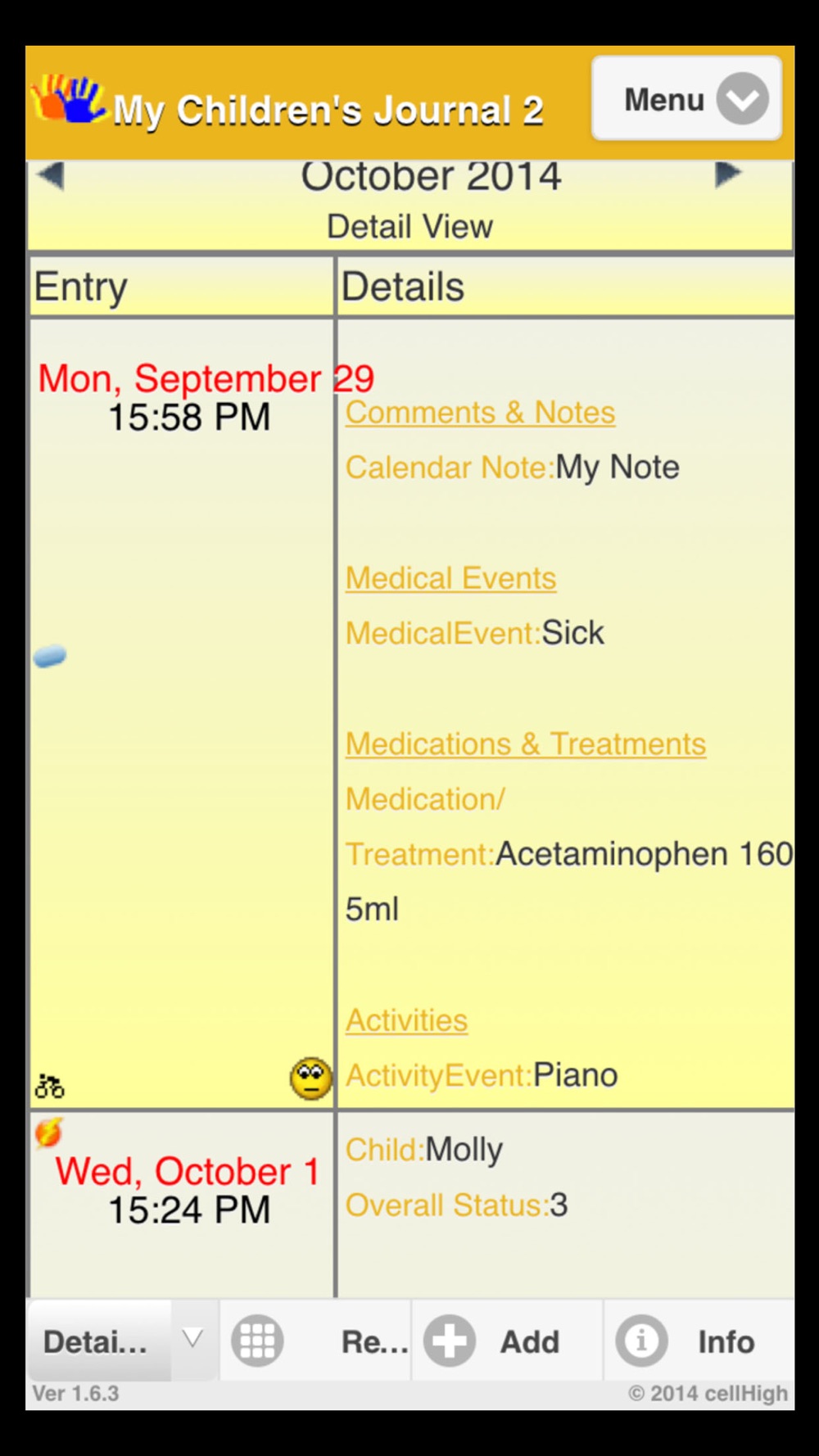 Are you having trouble remembering all the details of your children's lives? Do you want all your child's records and information at your fingertips? How can Children’s Journal help? It helps you track your child’s health, school records, school activities, and outside activities easily with only a few screen taps. Enter as little or as much data as you need. Create new items, new medication names, new events, new teacher names, new symptoms etc. in your selectable lists. Children’s Journal will also allow you to export your data to a spread sheet. This is one of the most helpful tools for keeping track of your child’s life. One of the keys to healthy and happy children involves successfully keeping track of their busy lives. Do you want all of your child’s health records and information at your fingertips so that you can start feeling less stressed? Children’s Journal can help.