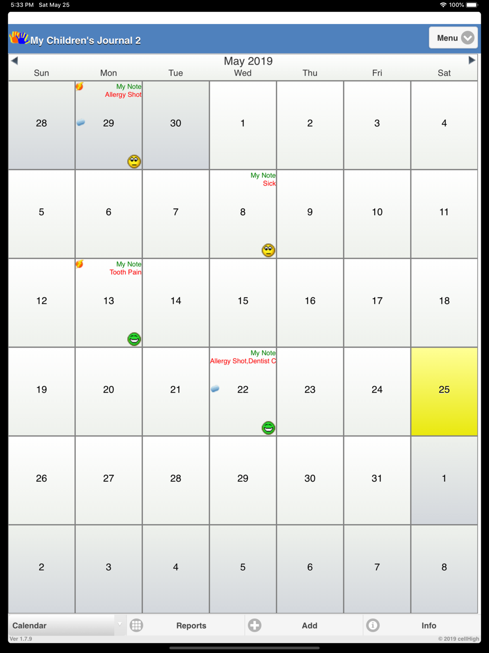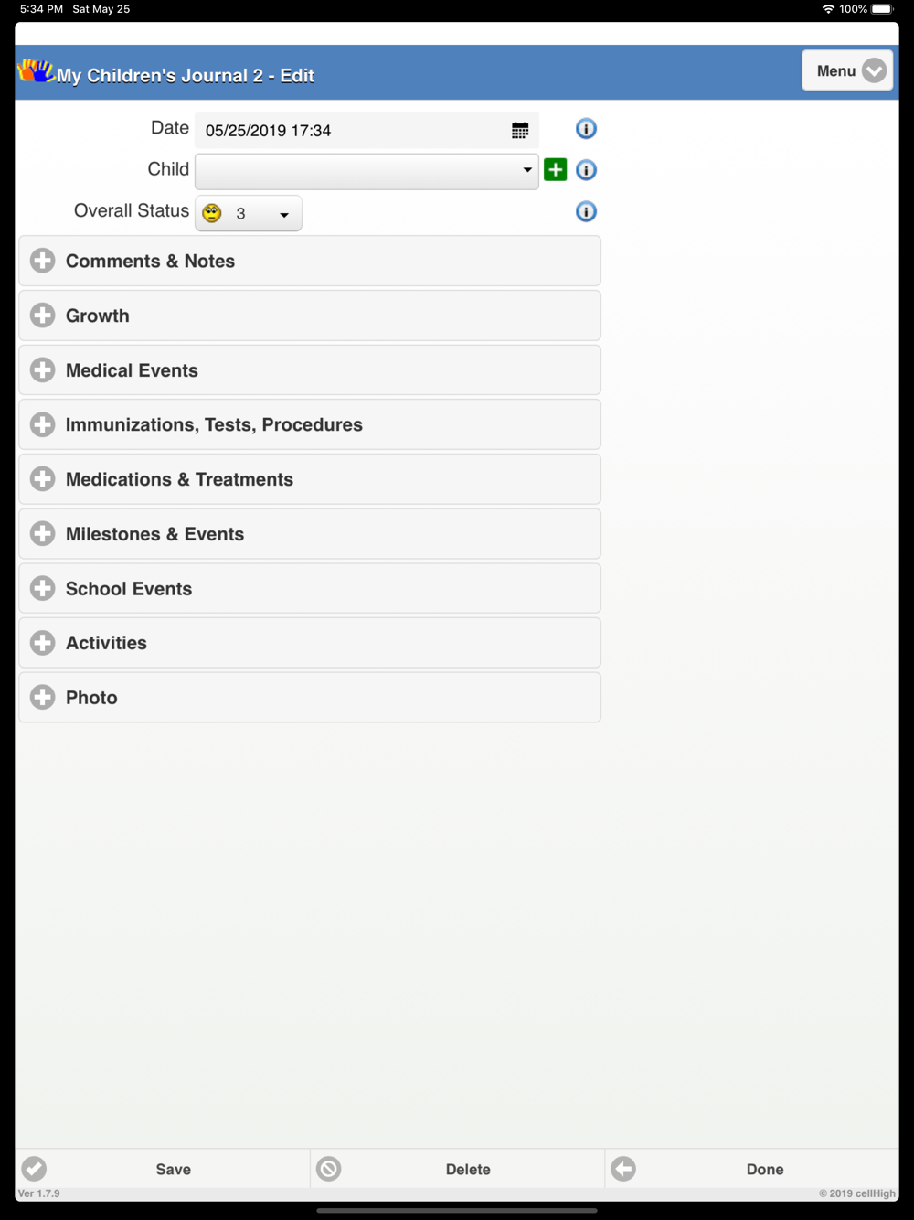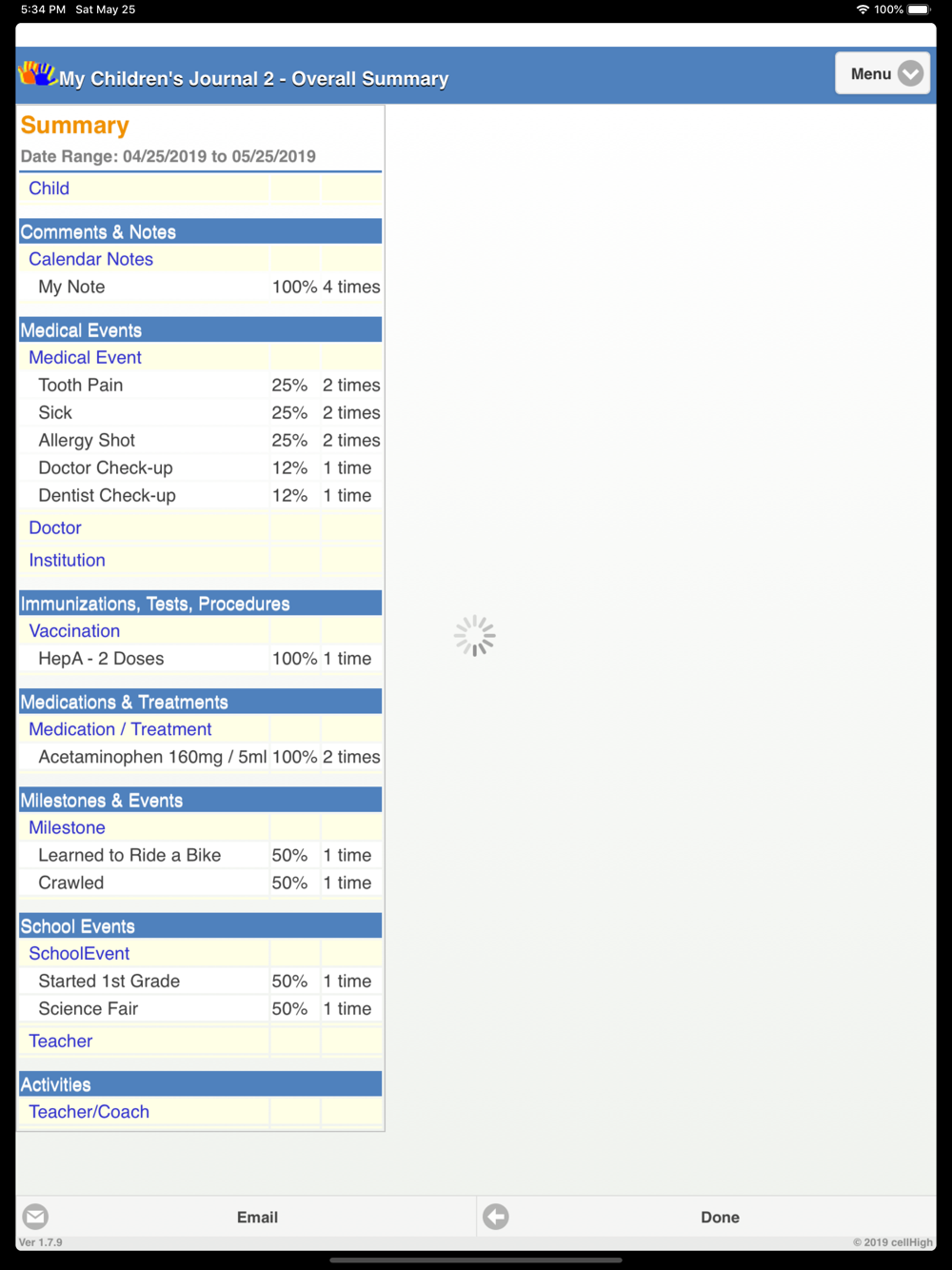 Are you having trouble remembering all the details of your children's lives? Do you want all your child's records and information at your fingertips? How can Children’s Journal help? It helps you track your child’s health, school records, school activities, and outside activities easily with only a few screen taps. Enter as little or as much data as you need. Create new items, new medication names, new events, new teacher names, new symptoms etc. in your selectable lists. Children’s Journal will also allow you to export your data to a spread sheet. This is one of the most helpful tools for keeping track of your child’s life. One of the keys to healthy and happy children involves successfully keeping track of their busy lives. Do you want all of your child’s health records and information at your fingertips so that you can start feeling less stressed? Children’s Journal can help.