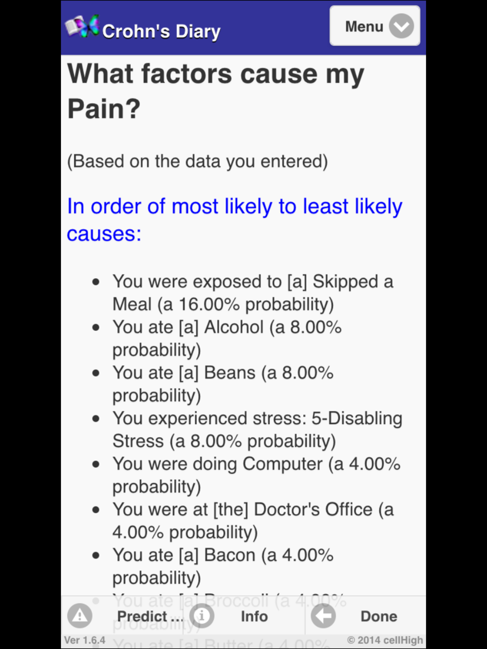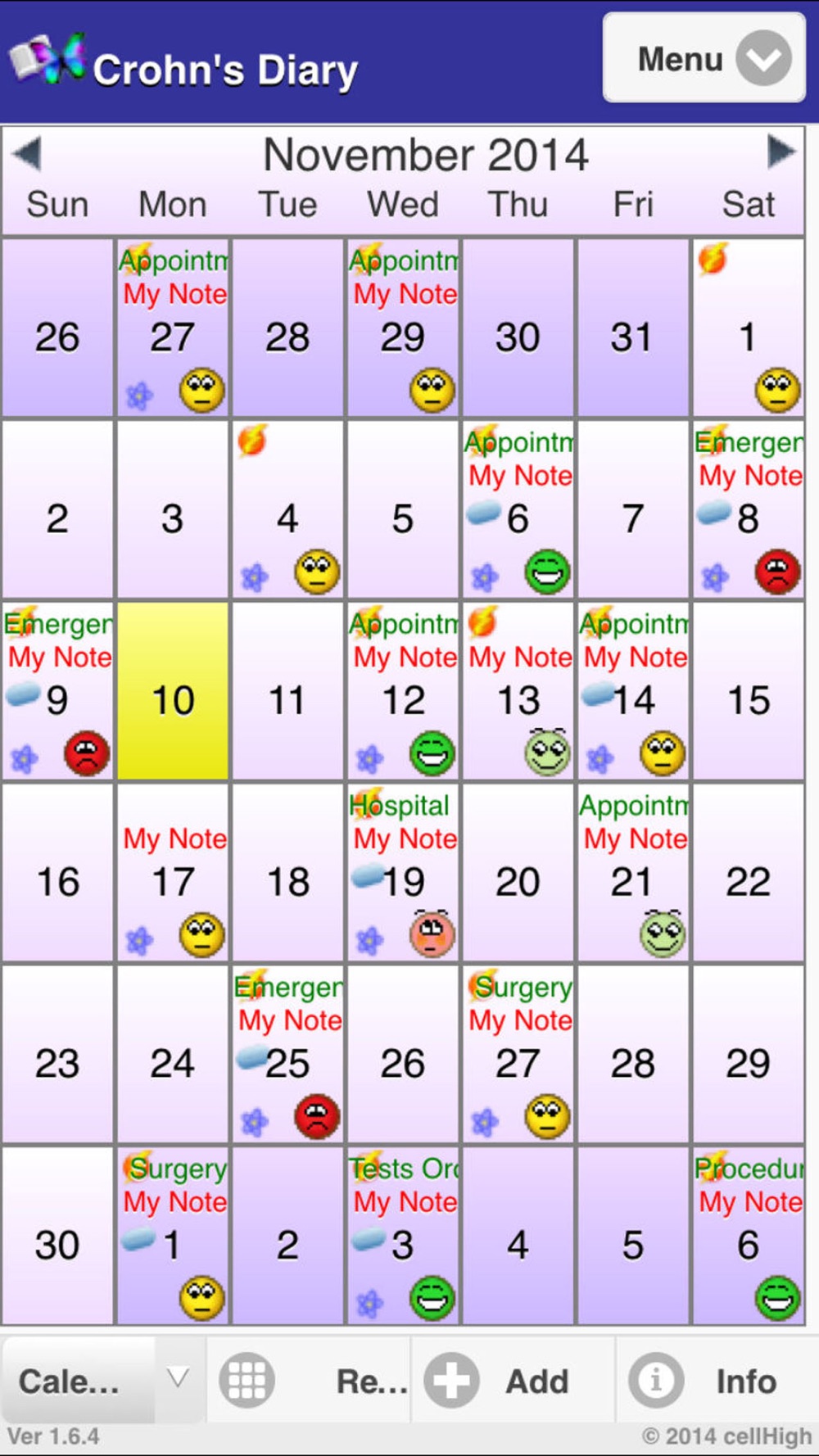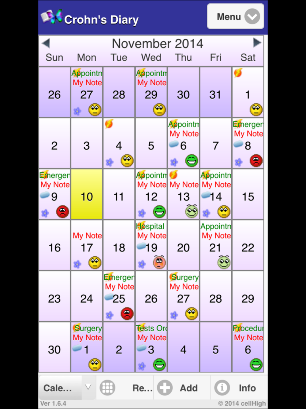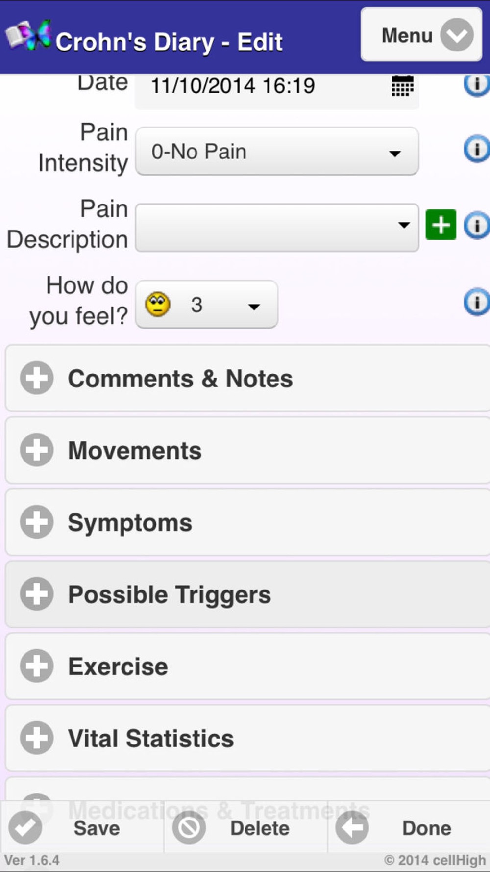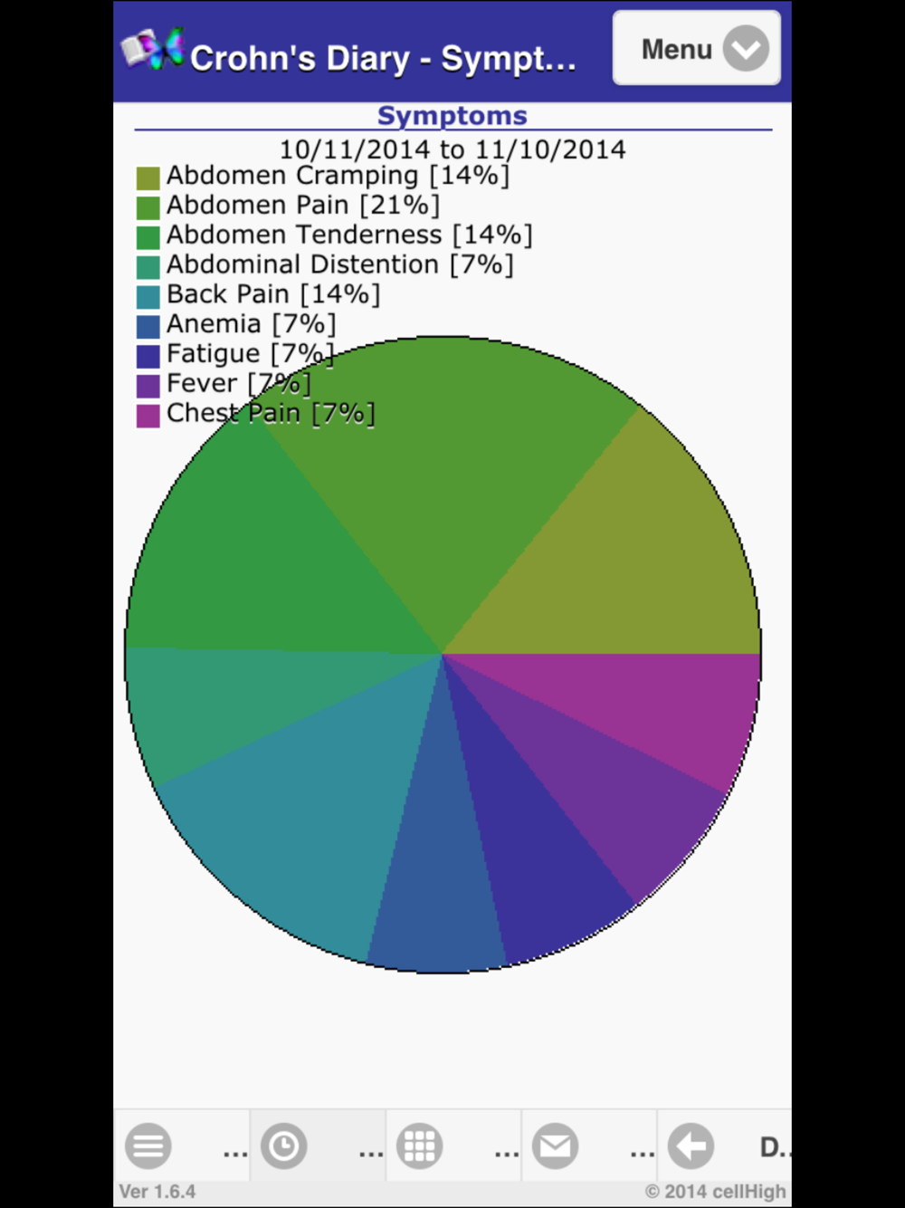 Are you like one of the thousands of people who suffer from Crohn’s Disease? How can Crohn’s Diary help? Crohn’s Diary was designed to track information about your Crohn’s Disease with a few screen taps. Using this information, the application will allow you to use triggers, like your stress, sleep and weather patterns, day of week, and diet, to predict and manage your Crohn’s Disease Pain and Symptoms. Crohn’s Diary has a new “Trending and Forecasting” module that shows you which factors and triggers contribute to your pain and symptoms. This will help you feel better and will allow you to take control of your disease. Crohn’s Diary makes it easy to perform tasks like tracking your treatment progress, graphing your patterns, emailing reports, including graphical attachments to your doctor and advisors. Crohn’s Diary will also allow you to export your data to a spread sheet all with just a few screen taps. Do you want all of your Crohn’s Disease health records and information at your fingertips so that you can start feeling better. Crohn’s Diary can help.