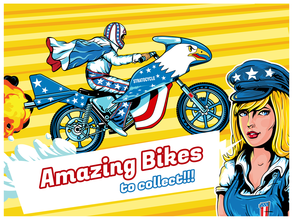 Earn money from completing jumps to buy loads of fantastic bikes and outfits, including his iconic White and Blue leathers and the awesome Jet-Powered Stratocycle!