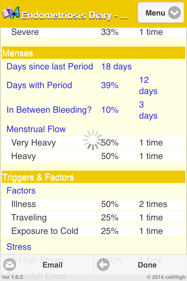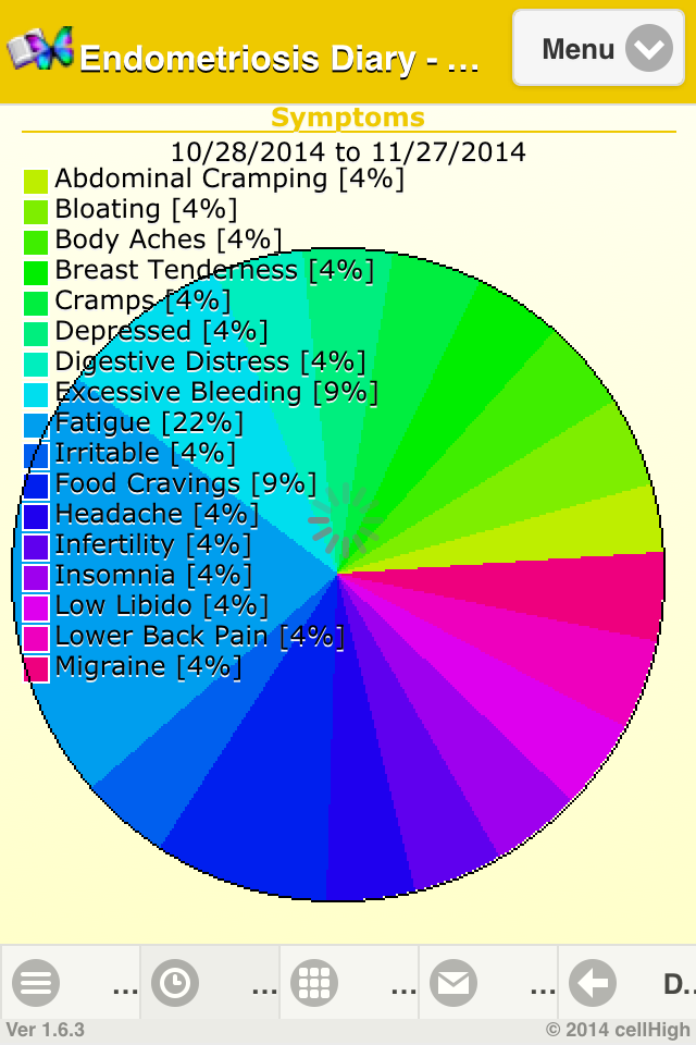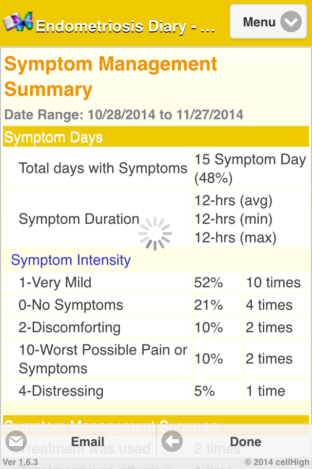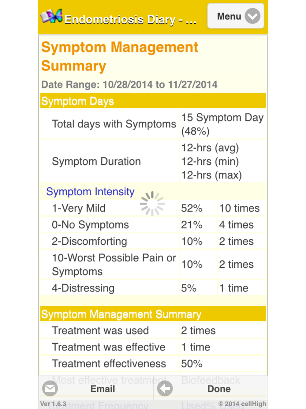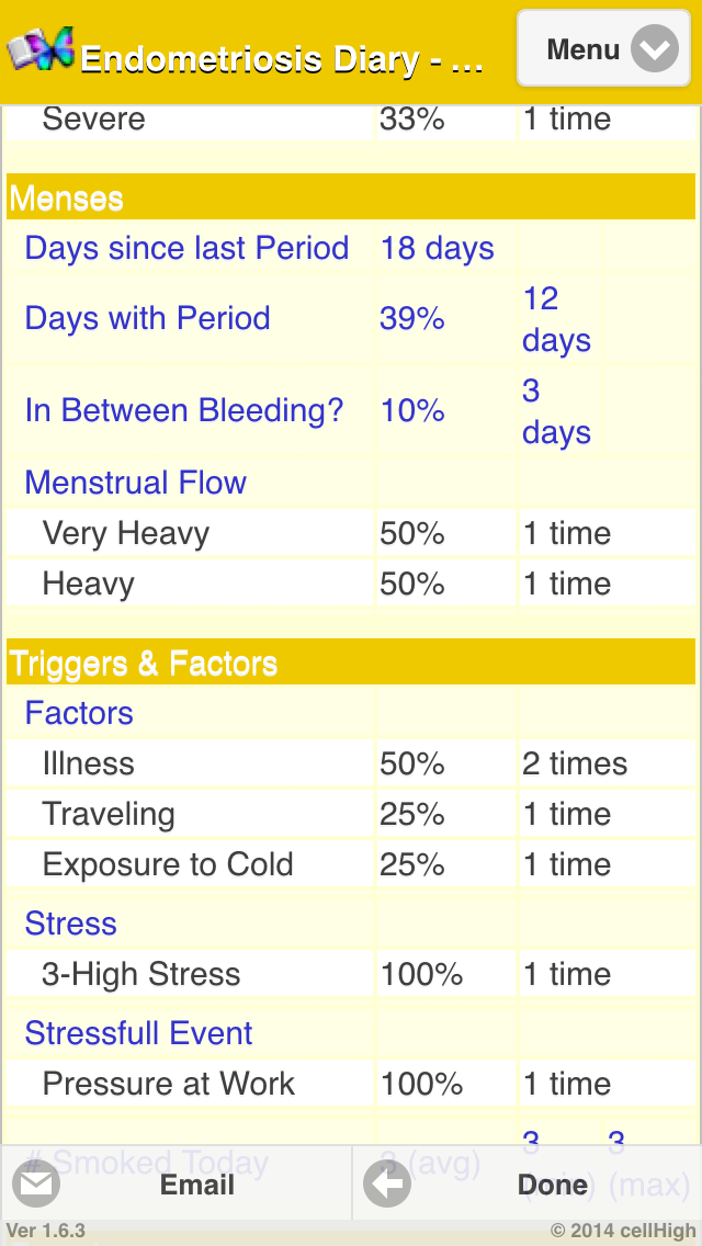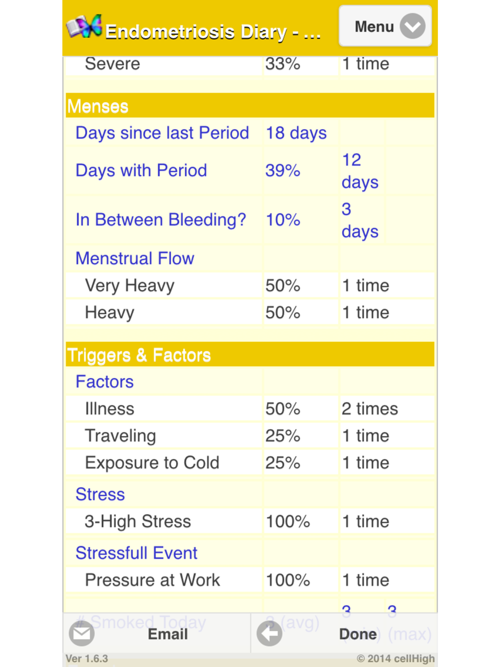 Are you like one of the millions of people who have Endometriosis? How can the Endometriosis Diary help? The Endometriosis Diary was designed to track information about your Endometriosis with a few screen taps. Using this information, the application will allow you to use triggers, like day of month and week and diet to predict and manage your Endometriosis. The Endometriosis Diary has a new “Trending and Forecasting” module that shows you which factors and triggers contribute to your pain and symptoms. This will help you feel better and will allow you to take control of your Endometriosis. The Endometriosis Diary makes it easy to perform tasks like tracking your treatment progress, graphing your patterns, emailing reports, including graphical attachments to your doctor and advisors. The Endometriosis Diary will also allow you to export your data to a spread sheet all with just a few screen taps. Do you want all of your health records and information at your fingertips so that you can start feeling better. The Endometriosis Diary can help.