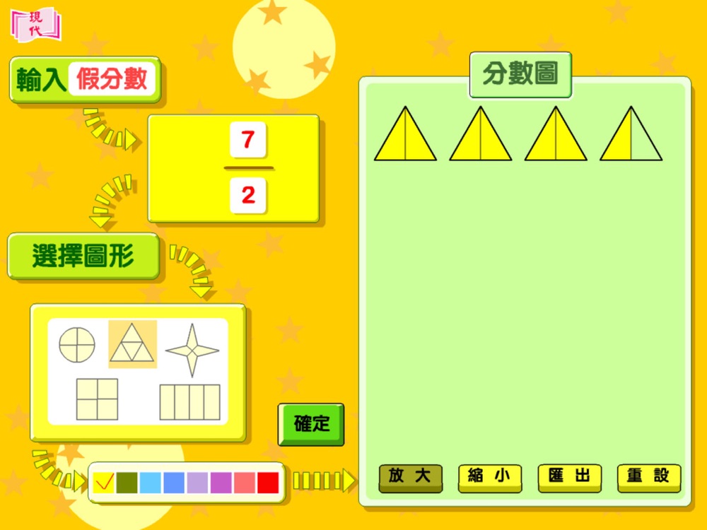 此製圖工具讓學生和老師輕鬆製作表示不同分數的圖,程式提供真分數、帶分數、假分數,以及多個不同圖形給學生和老師選擇。
