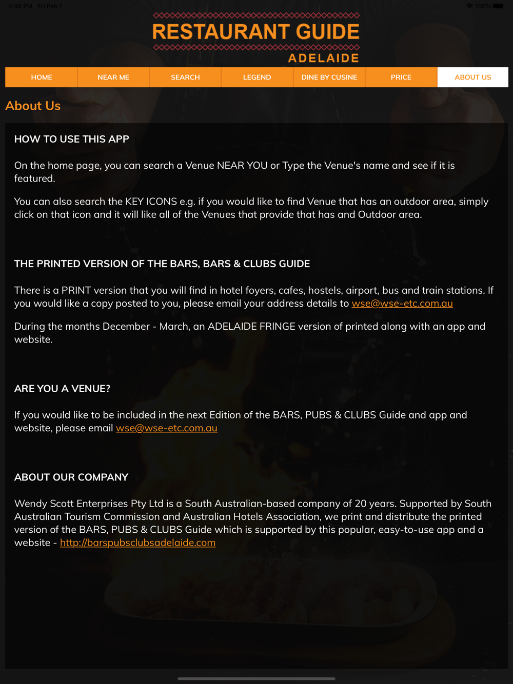 Wendy Scott Enterprises Pty Ltd is a South Australian-based company of 20 years. Supported by South Australian Tourism Commission and Australian Hotels Association, we print and distribute the printed version of the RESTAURANT Guide which is supported by this popular, easy-to-use app and a website - http://restaurants.wse-etc.com.au/