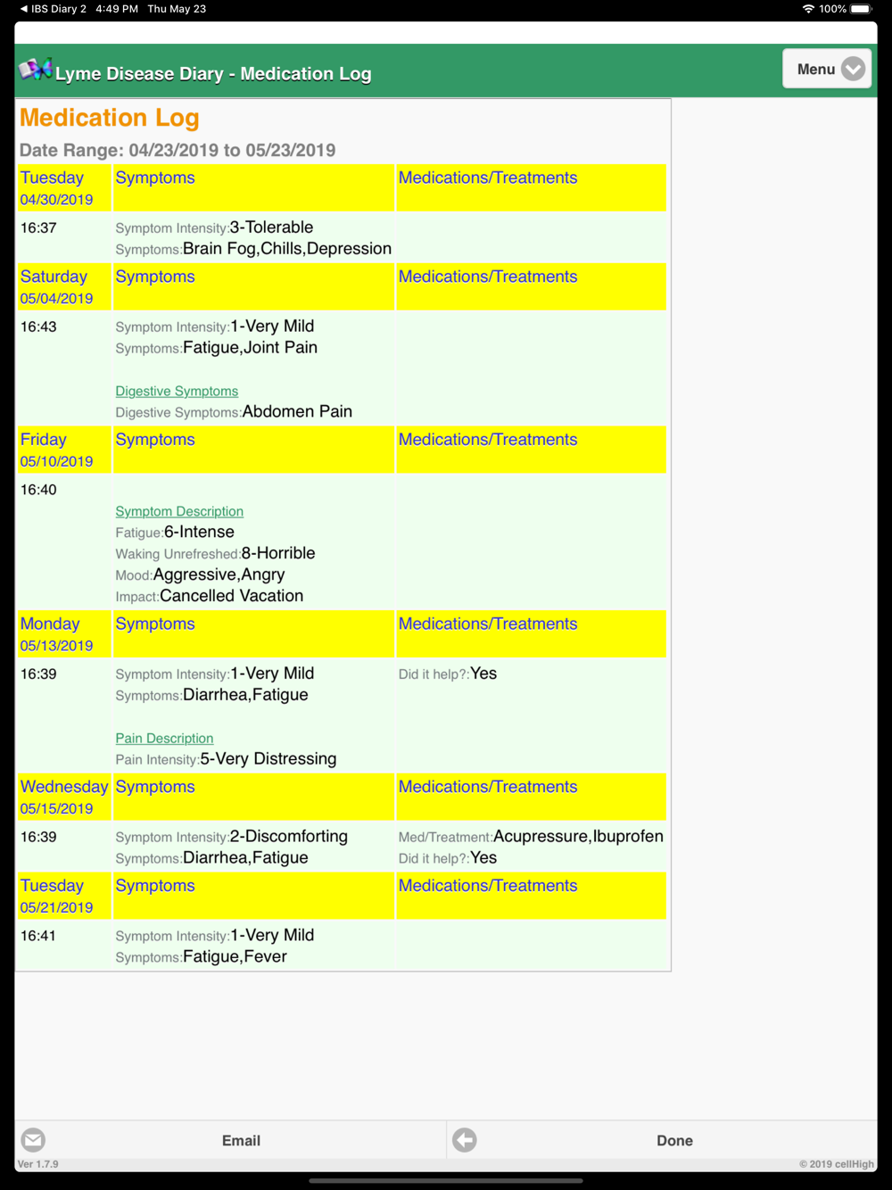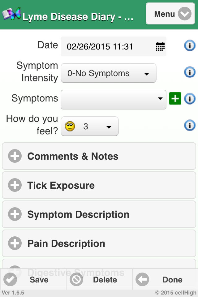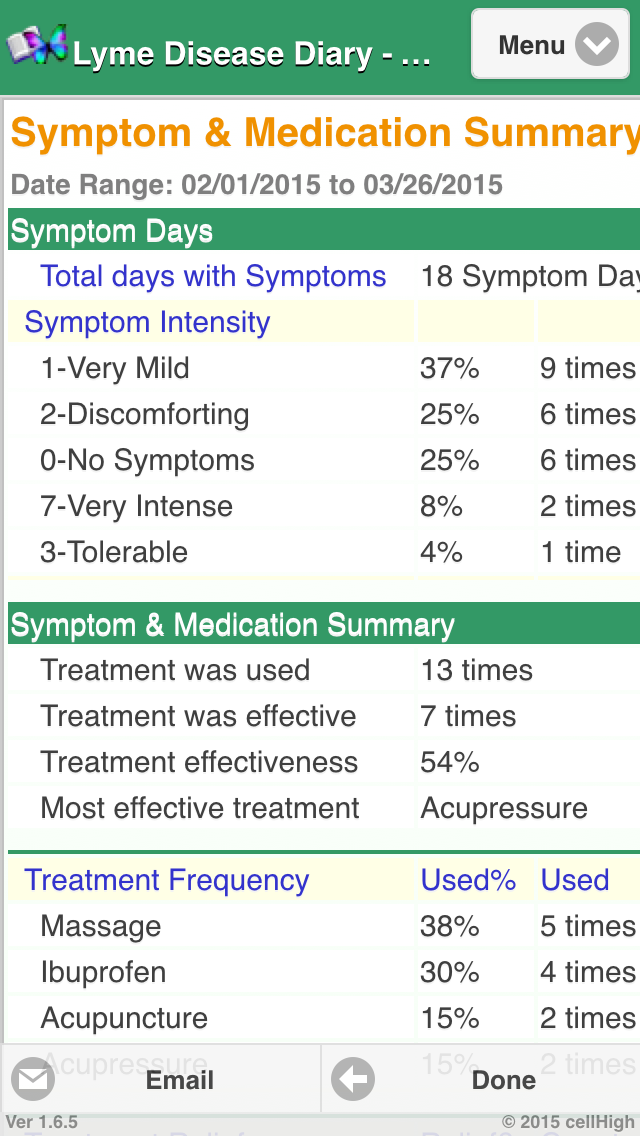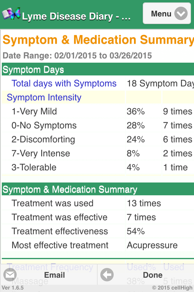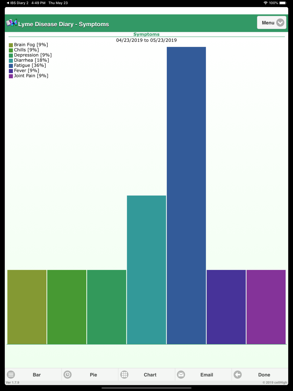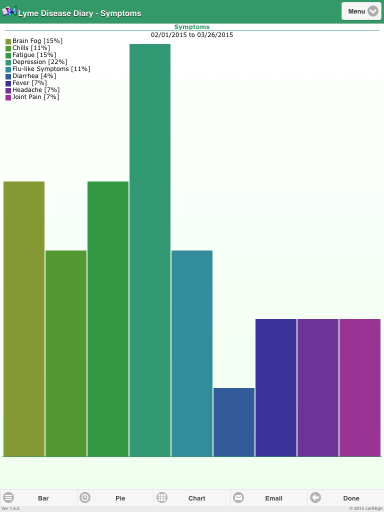 Are you like one of the millions of people who suffer from Lyme Disease? How can the Lyme Disease Diary help? The Lyme Disease Diary was designed to track information about you condition with a few screen taps. Using this information, the application will allow you to use triggers, like your stress, diet, day of week, etc to predict and manage your Lyme Disease Symptoms. The Lyme Disease Diary has a new “Trending and Forecasting” module that shows you which factors and triggers contribute to your symptoms. This will help you feel better and will allow you to take control of your symptoms. The Lyme Disease Diary makes it easy to perform tasks like tracking your treatment progress, graphing your patterns, emailing reports, including graphical attachments to your doctor and advisors. The Lyme Disease Diary will also allow you to export your data to a spread sheet all with just a few screen taps. Do you want all of your Lyme Disease health records and information at your fingertips so that you can start feeling better. The Lyme Disease Diary can help.