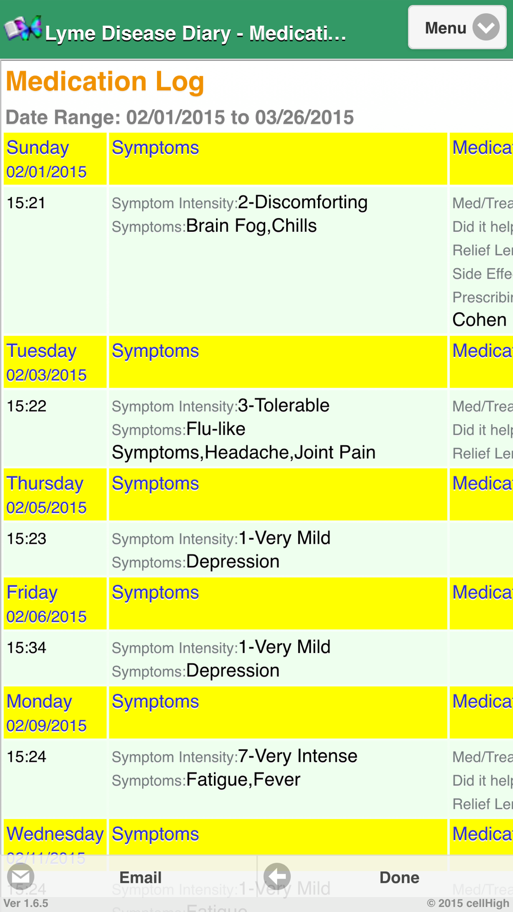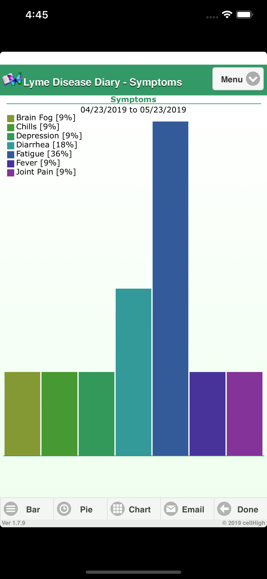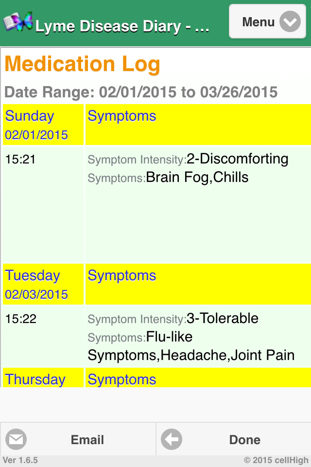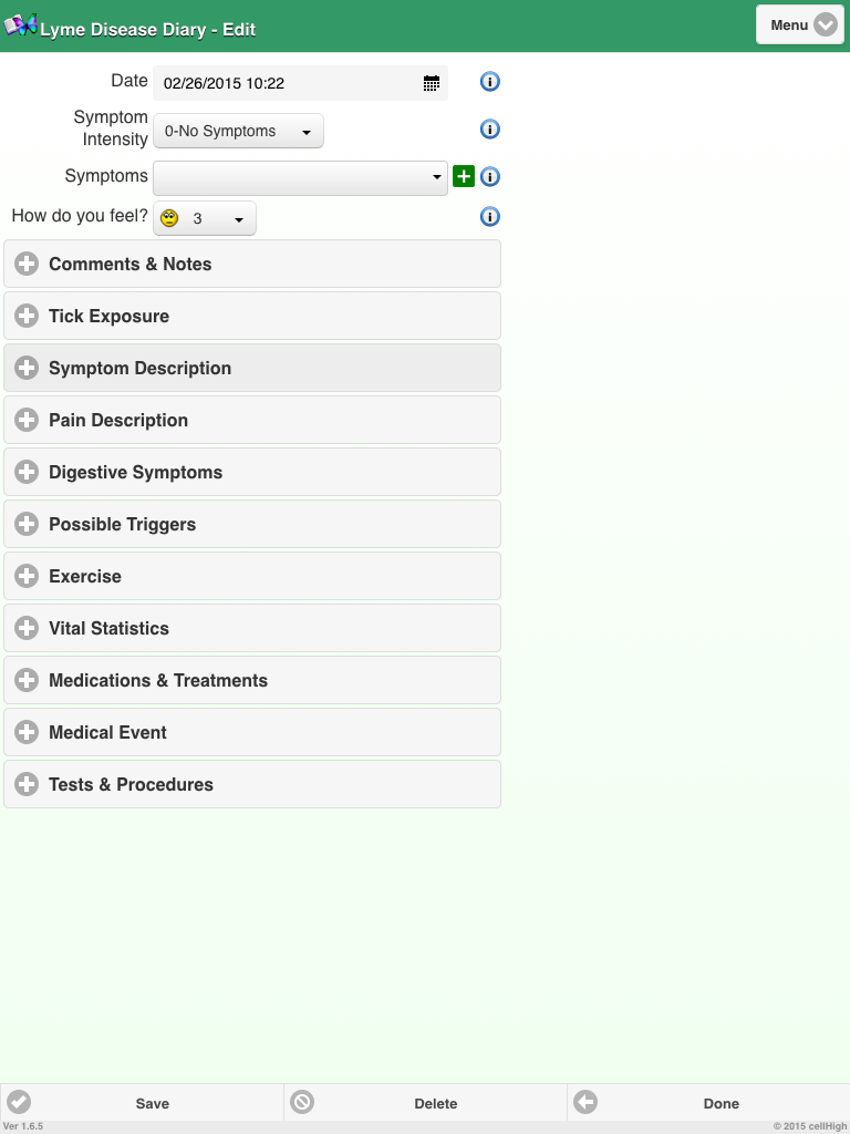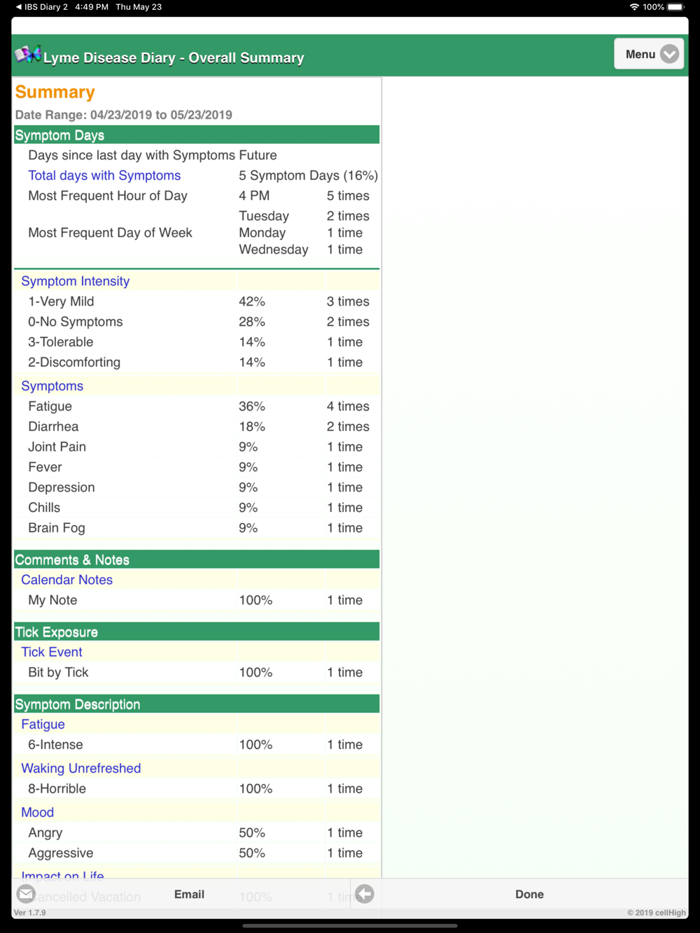 Are you like one of the millions of people who suffer from Lyme Disease? How can the Lyme Disease Diary help? The Lyme Disease Diary was designed to track information about you condition with a few screen taps. Using this information, the application will allow you to use triggers, like your stress, diet, day of week, etc to predict and manage your Lyme Disease Symptoms. The Lyme Disease Diary has a new “Trending and Forecasting” module that shows you which factors and triggers contribute to your symptoms. This will help you feel better and will allow you to take control of your symptoms. The Lyme Disease Diary makes it easy to perform tasks like tracking your treatment progress, graphing your patterns, emailing reports, including graphical attachments to your doctor and advisors. The Lyme Disease Diary will also allow you to export your data to a spread sheet all with just a few screen taps. Do you want all of your Lyme Disease health records and information at your fingertips so that you can start feeling better. The Lyme Disease Diary can help.