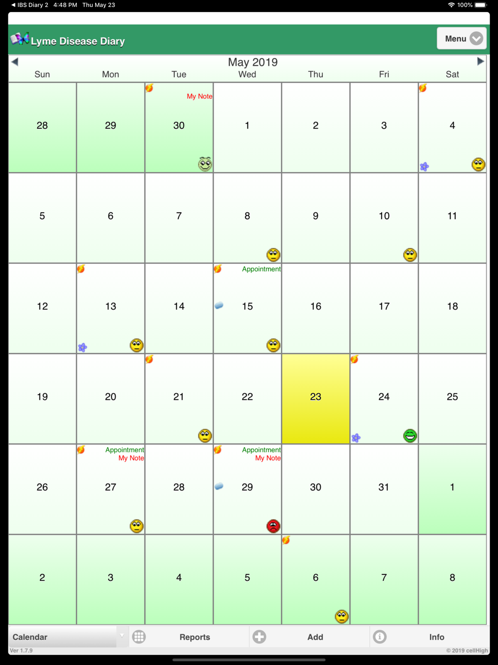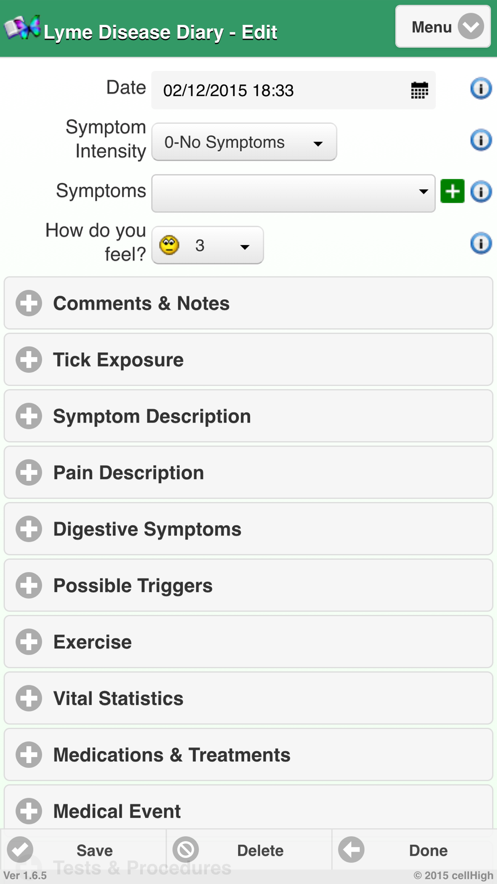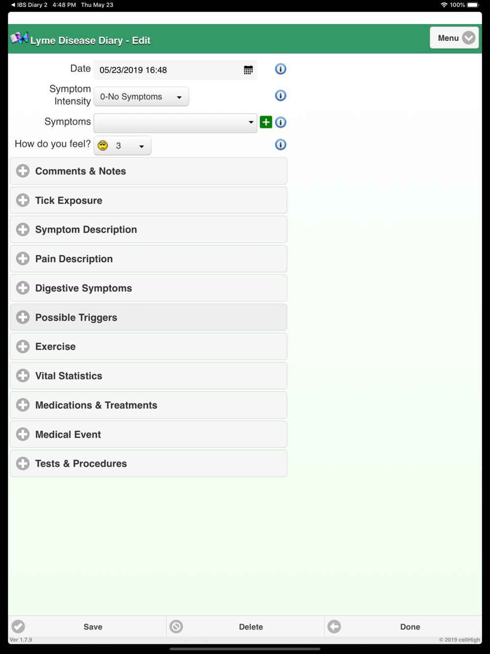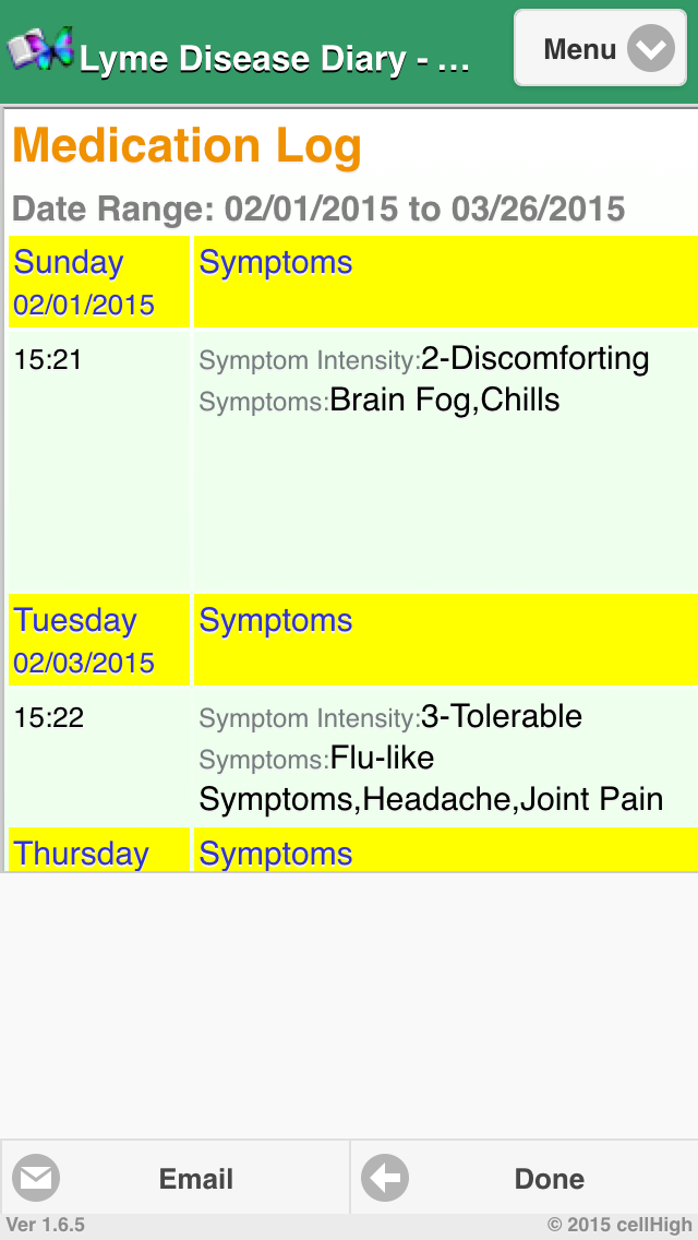 Are you like one of the millions of people who suffer from Lyme Disease? How can the Lyme Disease Diary help? The Lyme Disease Diary was designed to track information about you condition with a few screen taps. Using this information, the application will allow you to use triggers, like your stress, diet, day of week, etc to predict and manage your Lyme Disease Symptoms. The Lyme Disease Diary has a new “Trending and Forecasting” module that shows you which factors and triggers contribute to your symptoms. This will help you feel better and will allow you to take control of your symptoms. The Lyme Disease Diary makes it easy to perform tasks like tracking your treatment progress, graphing your patterns, emailing reports, including graphical attachments to your doctor and advisors. The Lyme Disease Diary will also allow you to export your data to a spread sheet all with just a few screen taps. Do you want all of your Lyme Disease health records and information at your fingertips so that you can start feeling better. The Lyme Disease Diary can help.