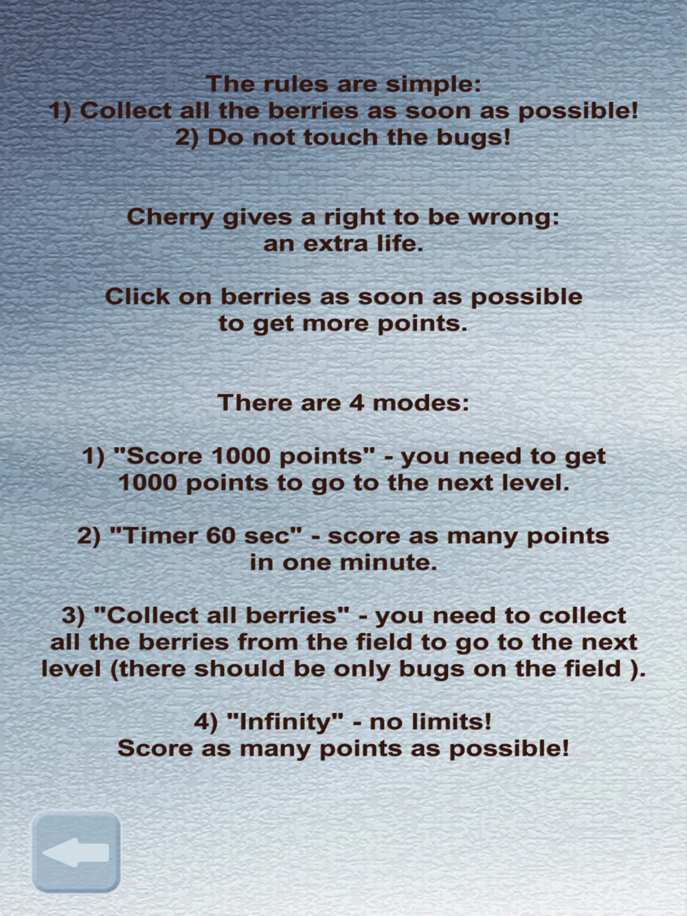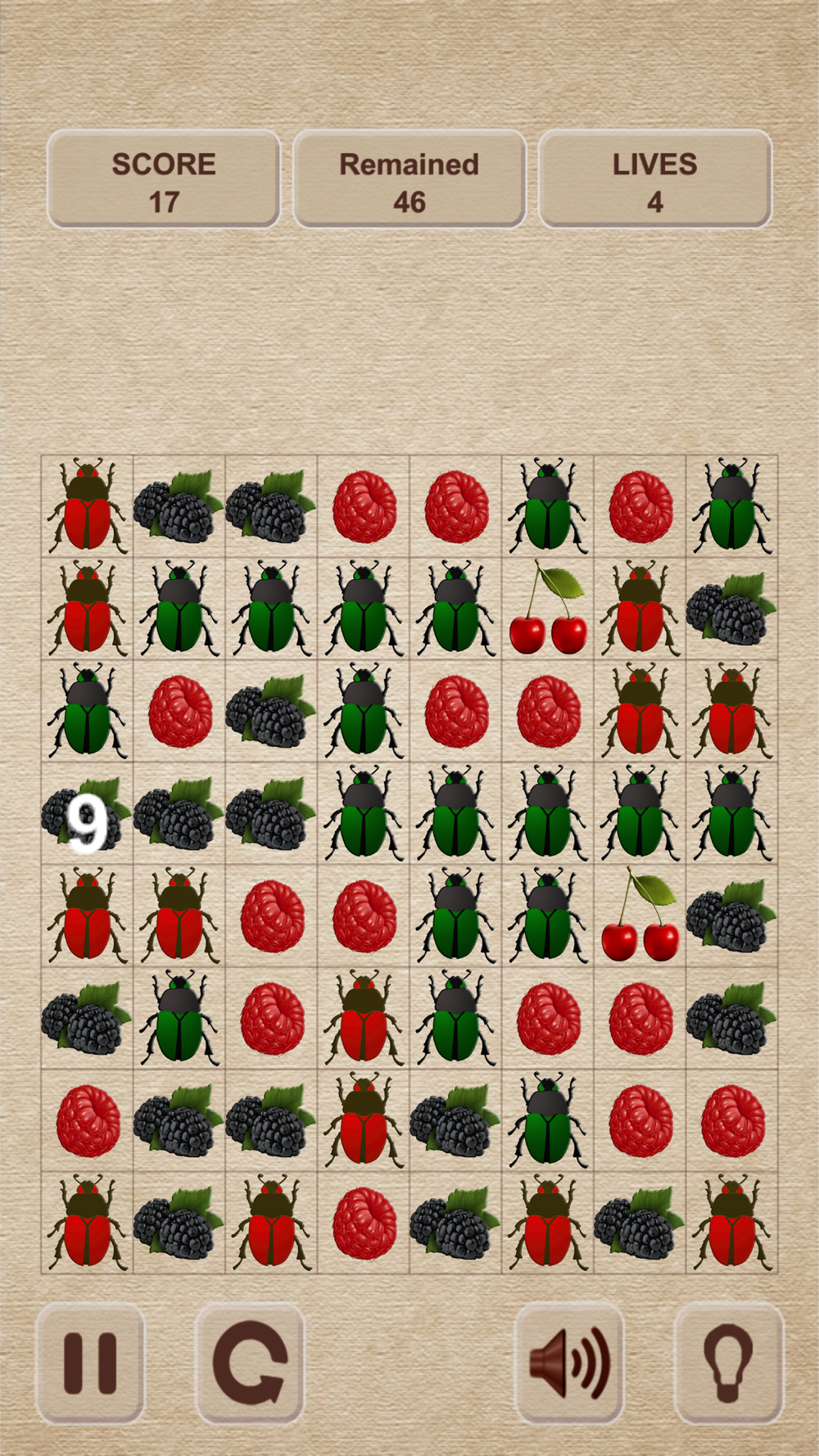 3) "Collect all berries" - you need to collect all the berries from the field to go to the next level (there should be only bugs on the field ).