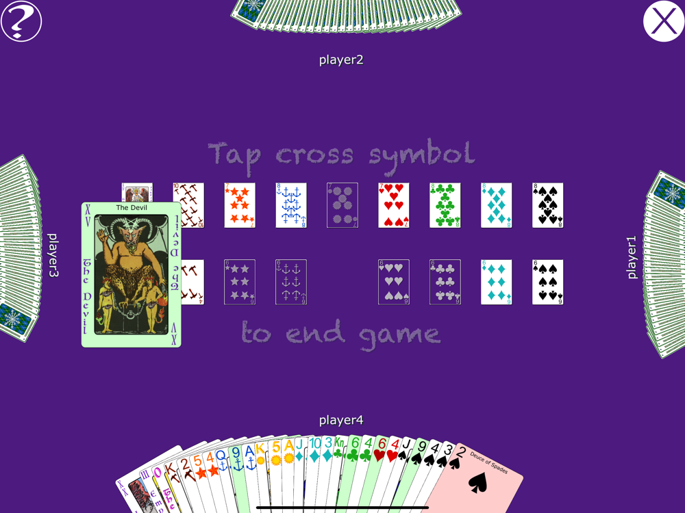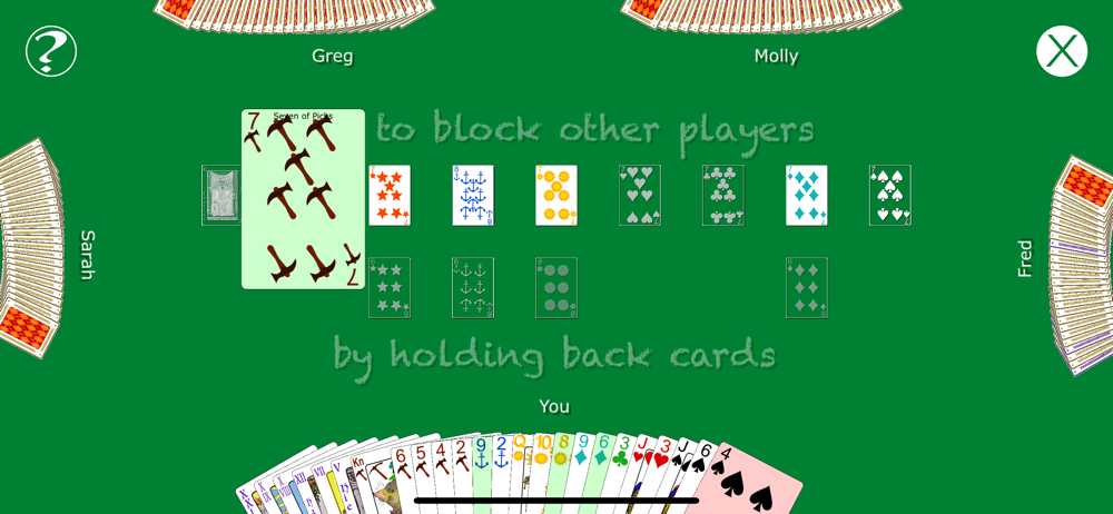 The player with the Seven of Diamonds starts. Players open each suite with the Seven of that suite. After the suite has been opened the players lay out the cards of the suite above and below the Seven in order, adding cards in sequence down to the ace and up to the king. If a player can not lay down a card then they 'Knock' and the turn passes to the next player. The first player to run out of cards wins the hand.