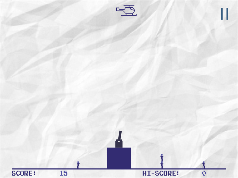 Helicopters fly across the screen at varying heights, dropping paratroopers. The gun may fire multiple shots at once, and the shots may destroy helicopters or shoot paratroopers.