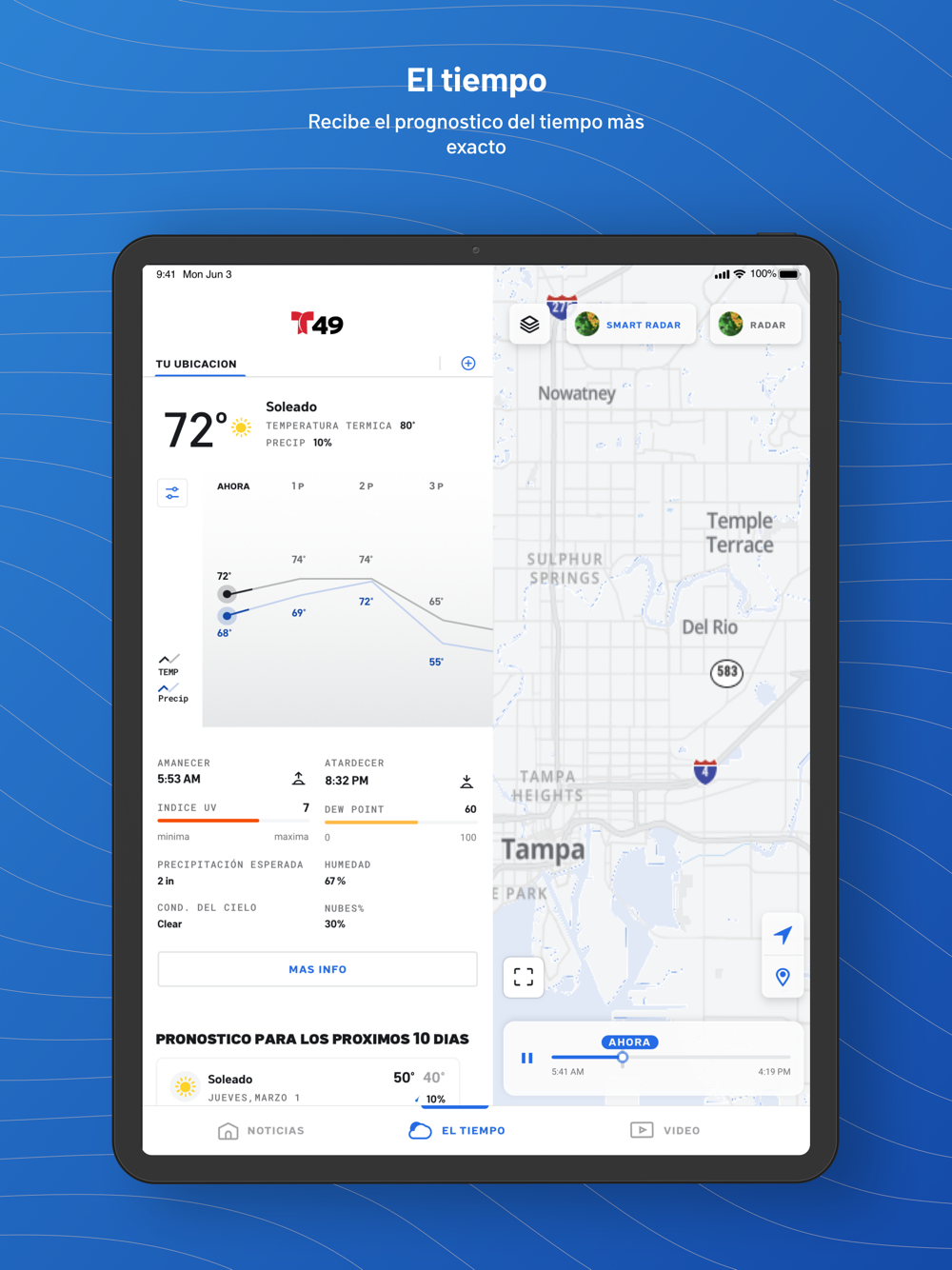 La rediseñada app de noticias y del tiempo de Telemundo 49 Tampa te conecta con los mejores contenidos locales, los pronósticos del tiempo más exactos, noticias de última hora, TV en vivo y periodismo investigativo.
