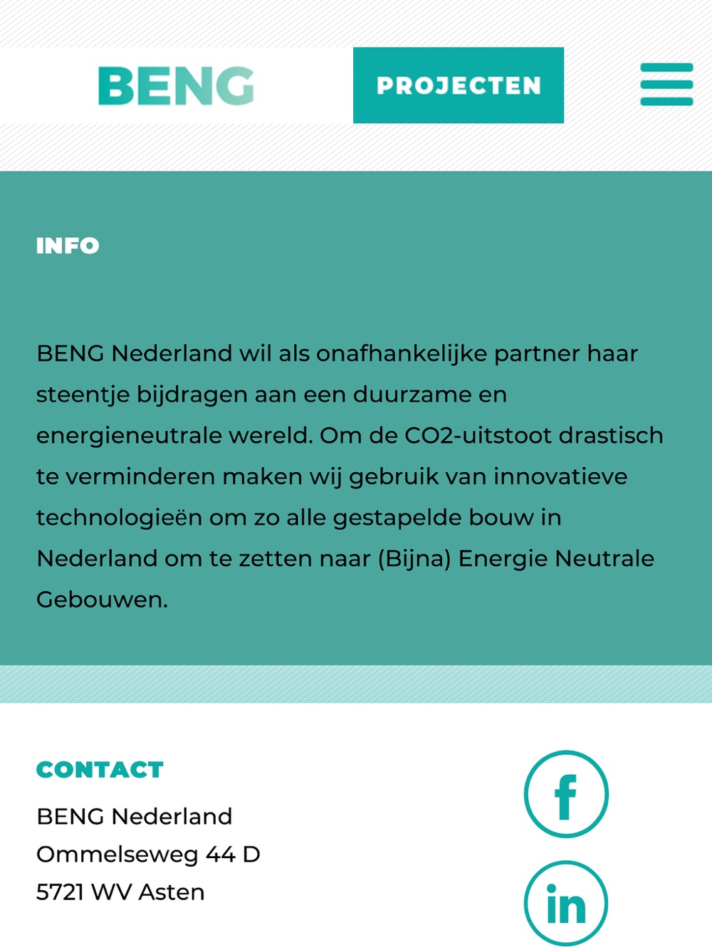 BENG Nederland werkt volgens een uniek concept. Wij opereren niet zoals een reguliere aannemer, maar bundelen onze krachten met onafhankelijke adviseurs, producenten en leveranciers als partners om tot het beste resultaat te komen voor onze opdrachtgevers. Omdat onze partners de vrijheid hebben om zelf te beslissen met welke uitvoerende partij zij in zee gaan, zijn wij als BENG niet gebonden aan vaste uitvoerende partijen. Dat komt onze on afhankelijkheid ten goede, houdt onze projecten prijstechnisch interessant en geeft ons de mogelijkheid om op te schalen.