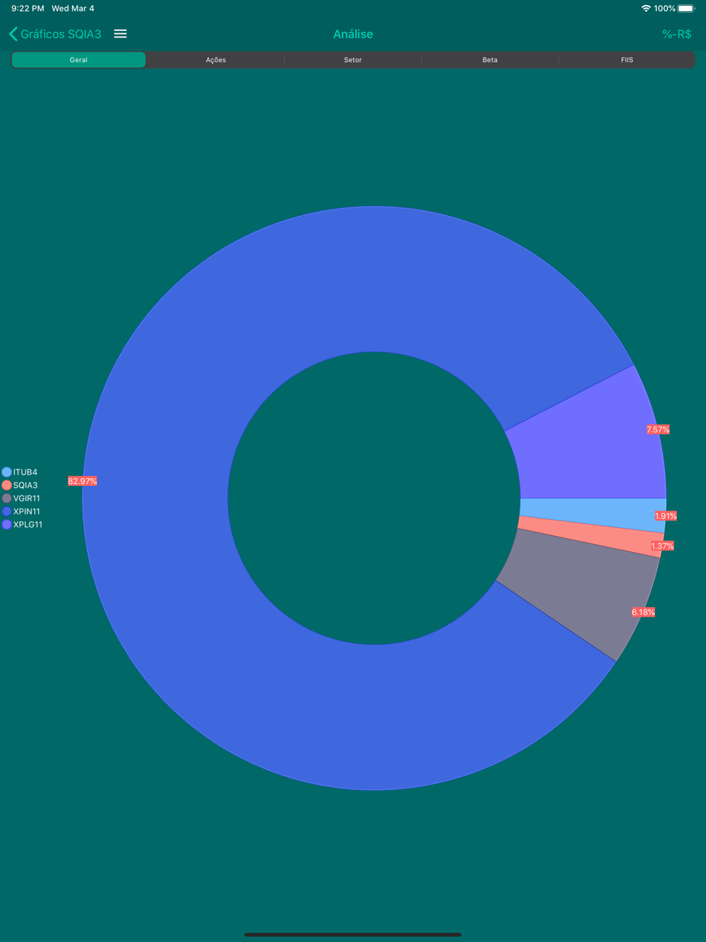 Acesse facilmente os gráficos intraday, 7 e 30 dias e visualize graficamente a composição percentual da sua carteira de ações.