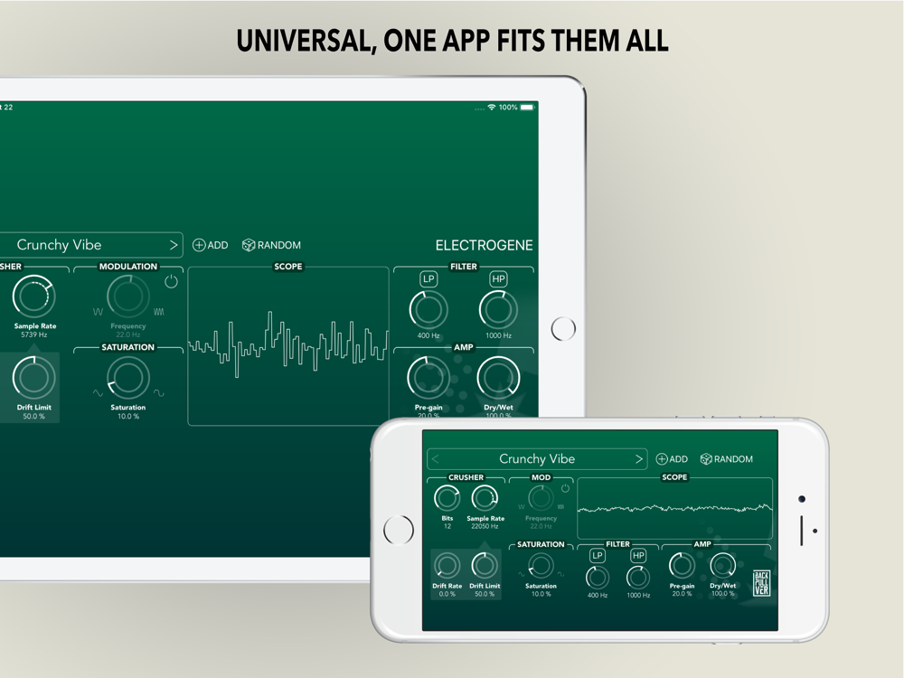 Electrogene is a low fidelity audio unit effect which combines bit-crusher, modulation, saturation and filter with scope visualizer. Refined algorithms can produce warm or harsh sound reminding of retro digital or analog audio system.