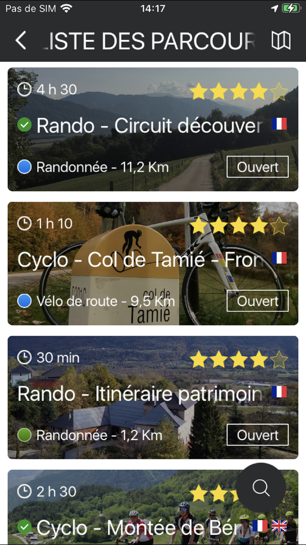 Depuis votre smartphone, en 1 clic, choisissez le parcours en fonction de votre pratique, vos envies (durée, niveau de difficulté, lieux..). Téléchargez le parcours sur votre téléphone chargé (pas besoin de réseau pour utiliser l’application) et c’est parti !