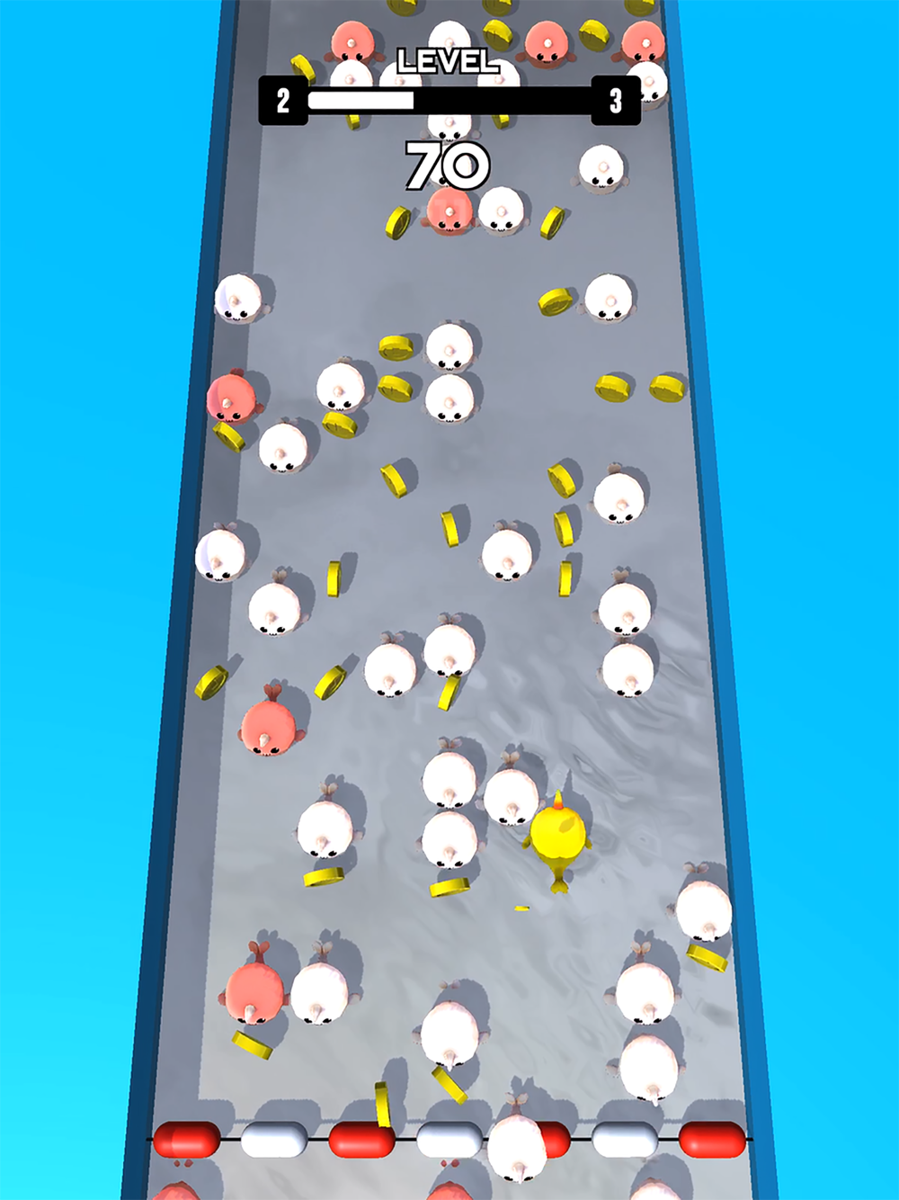 Drag to move your whale up the pool, collecting golden coins and don't be stop by the crowd.