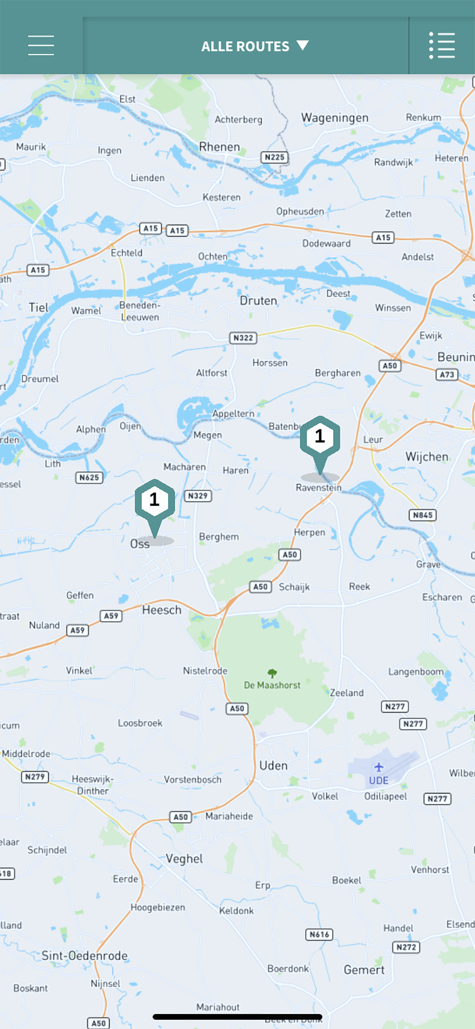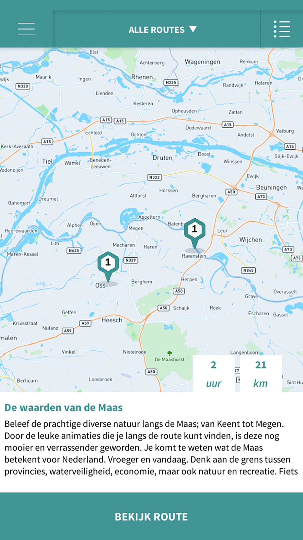 In deze app vind je wandel- en fietsroutes langs de Maas. In de loop der tijd zullen er meer routes bijkomen, want we zijn nog volop aan het ontwikkelen. Sommige locaties langs de route zijn verrijkt met een zogenaamde Augmented Reality belevingen. ‘Scan’ met je telefoon (wanneer dat gevraagd wordt) de grond en er verschijnt een animatie. Het is een echte driedimensionale animatie dus je kunt er naartoe en zelfs omheen wandelen. Op verschillende plekken zijn leuke animaties in de belevingen geplaatst. Kijk dus goed rond :-)