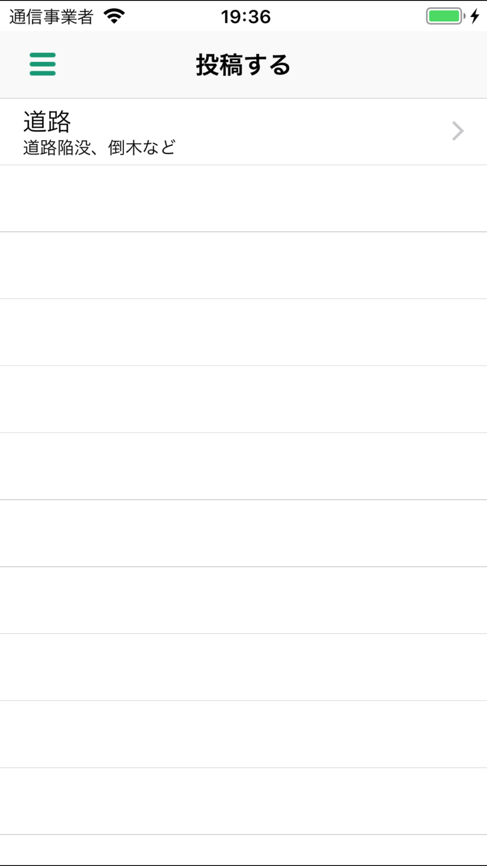 道路の陥没、舗装穴、側溝破損、倒木を選択し、位置情報や写真を付けて投稿することができます。