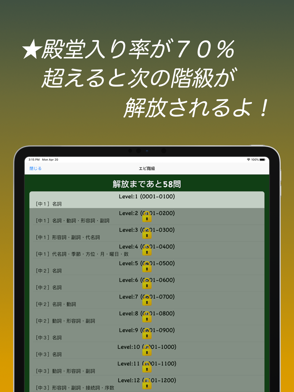 殿堂入り率が70%を超えると次の階級が解放され問題数が増加!