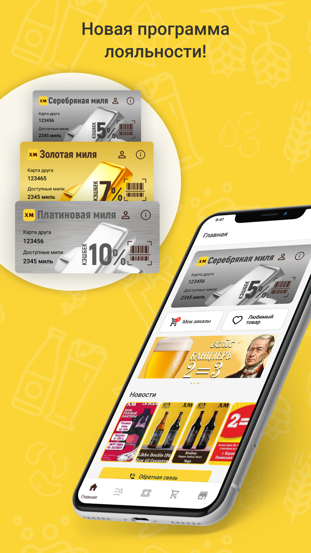 Удобная и понятная бонусная программа. "Прокачивайте" вашу карту друга с помощью покупок и посещений магазинов Хмельная Миля.