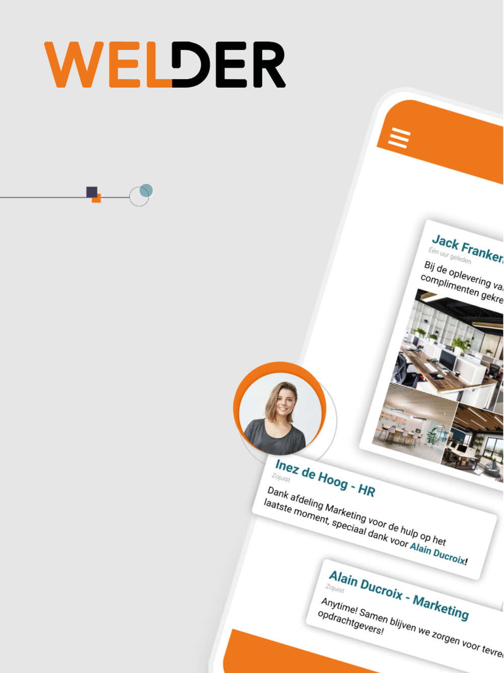 WELDER-app; het sociale platform voor jou en jouw collega’s om heel eenvoudig en snel nieuwe kennis, ideeën en successen met elkaar te delen. Dankzij handige features als timelines, eventkalender, groepen, pushnotificaties en speciale community acties word jij realtime geïnformeerd over alles wat er bij jouw werkgever gebeurt. Zo blijf je betrokken bij de organisatie en verbonden met je collega’s kris kras door de organisatie! Samen bouw je aan een gezellige en stevige bedrijfscultuur.