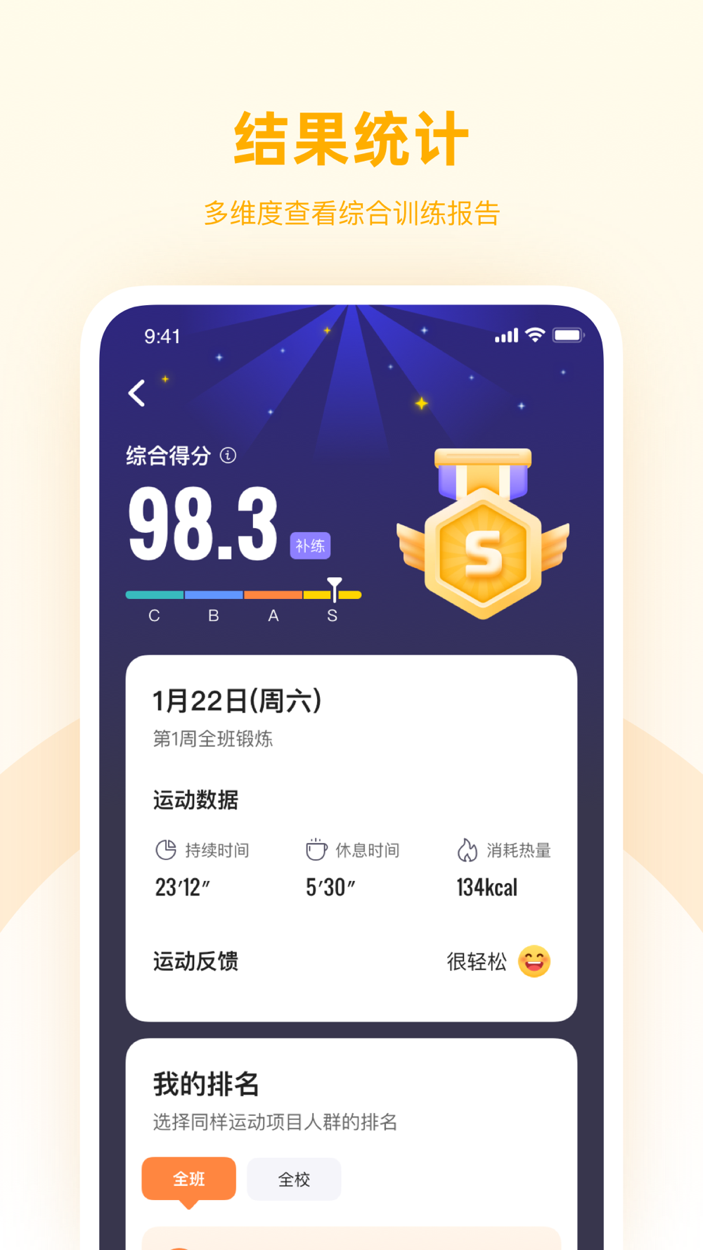 查看包括运动时间、消耗热量、智能测分等多维度的锻炼报告,还能查看和全班全校同学的锻炼对比以及每个动作的表现详情。