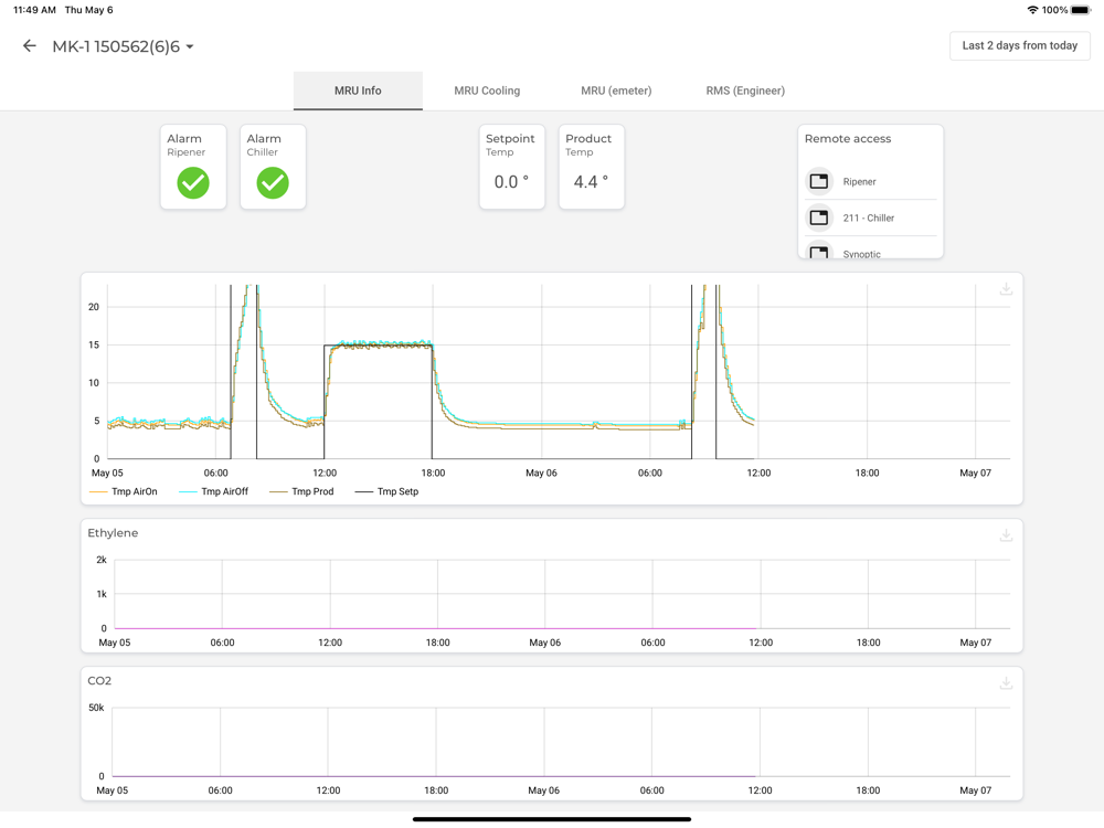 The SmartHarvest app lets you access you Ripening Control System (RCS) or Mobile Ripening Unit (MRU) all from a single place. If you have multiple centres or units, this is best way to have them all in the palm of your hand.
